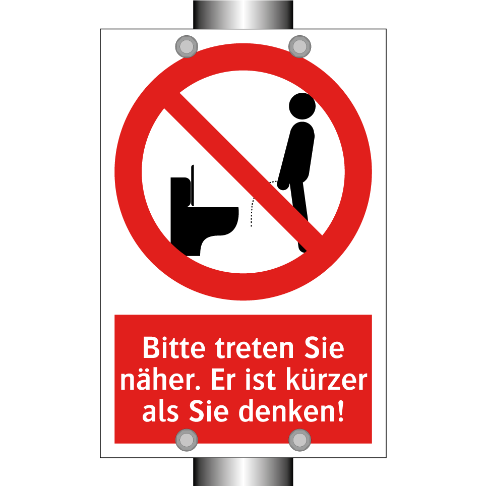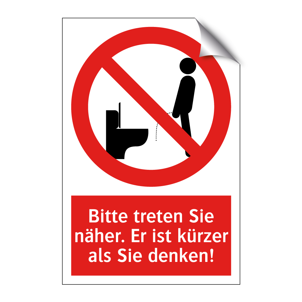Verbotsschild mit dem Text Bitte treten Sie näher. Er ist kürzer als Sie denken!