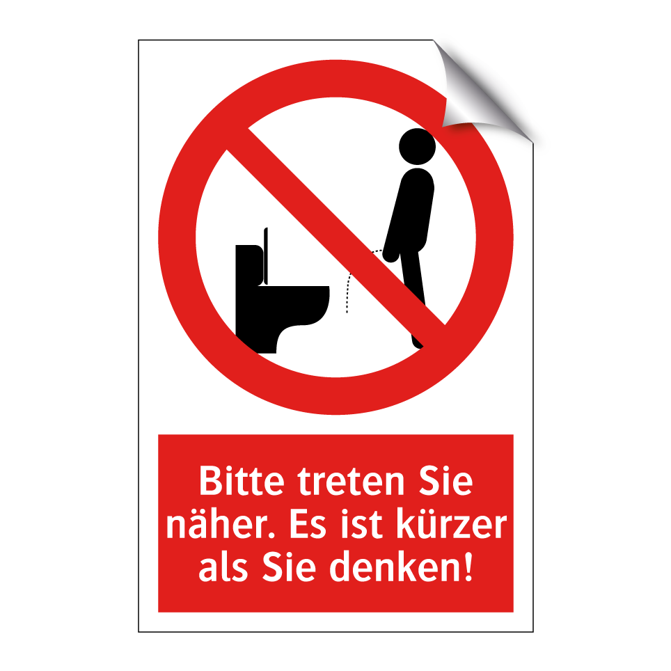 Verbotsschild mit dem Text Bitte treten Sie näher. Es ist kürzer als Sie denken!
