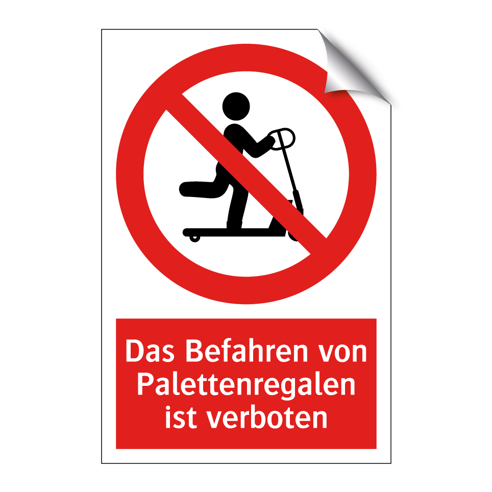 Verbotsschild mit dem Text Das Befahren von Palettenregalen ist verboten