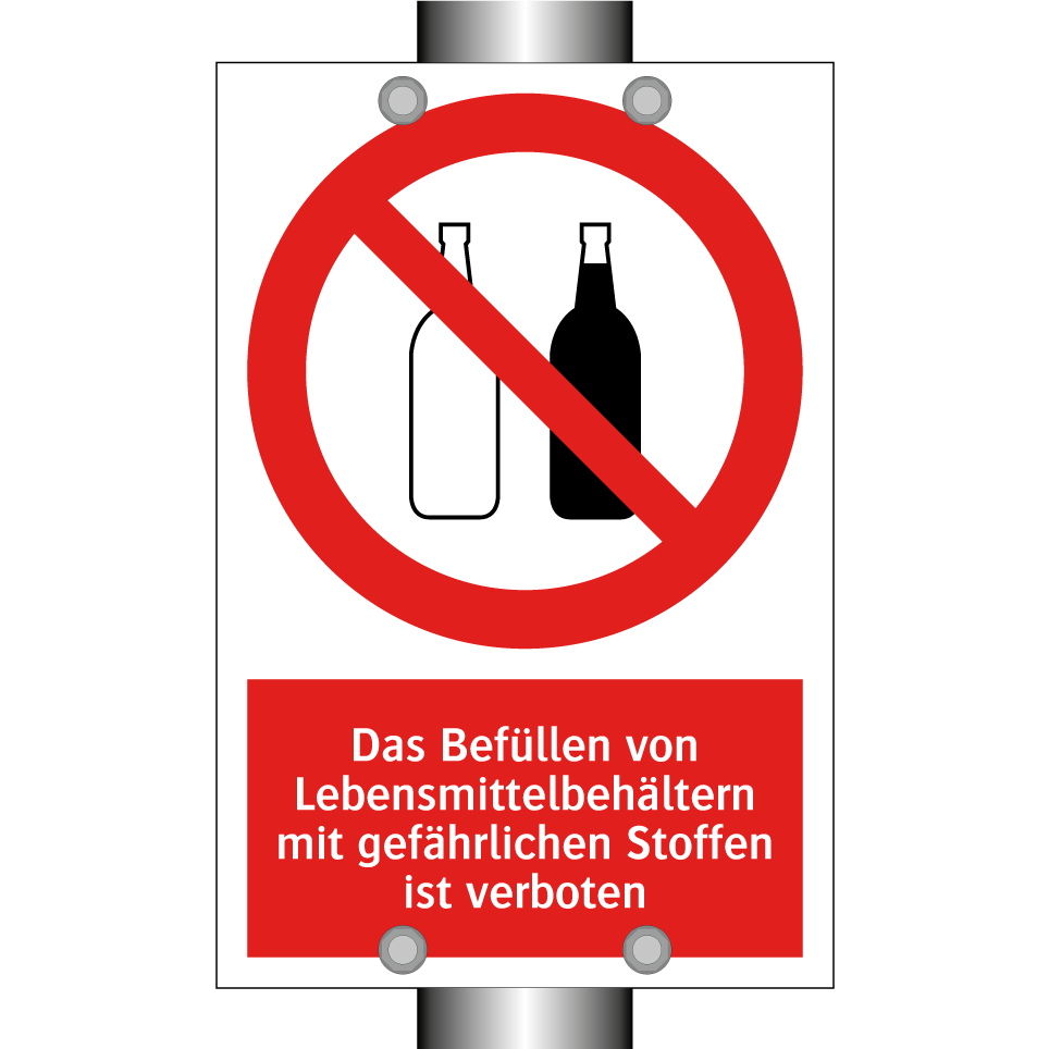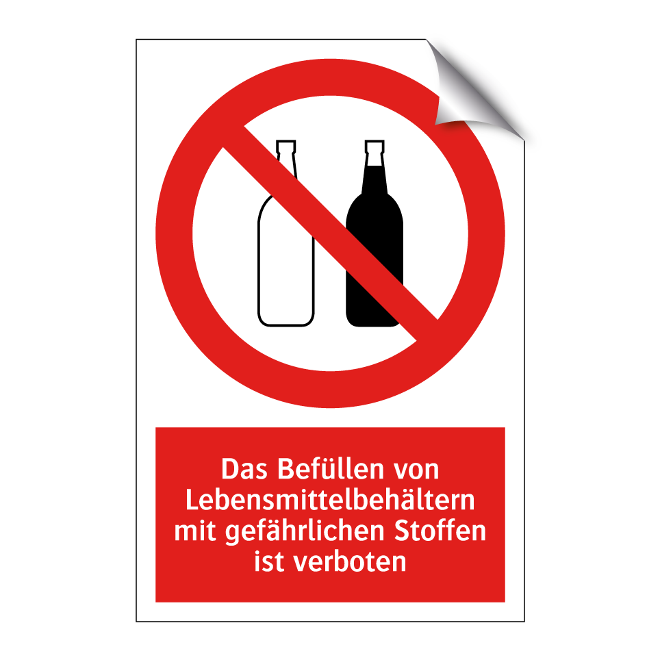 Verbotsschild mit dem Text Das Befüllen von Lebensmittelbehältern mit gefährlichen Stoffen ist verboten