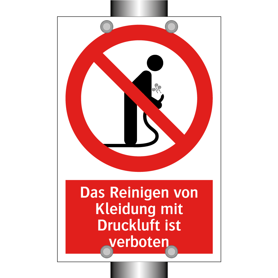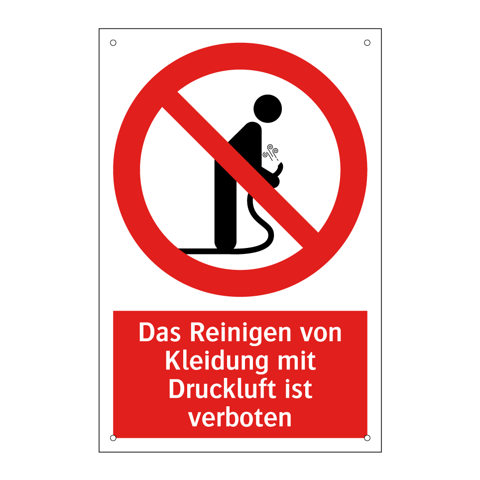 Verbotsschild mit dem Text Das Reinigen von Kleidung mit Druckluft ist verboten
