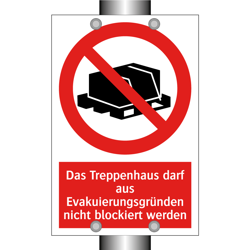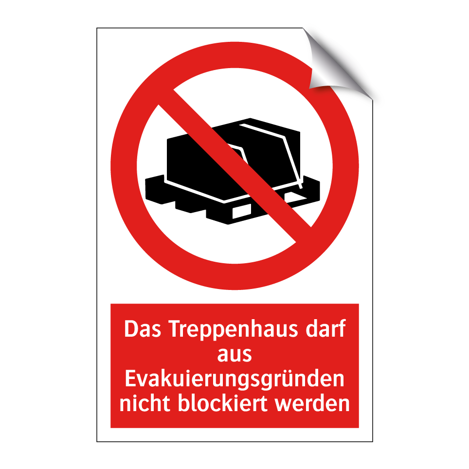 Verbotsschild mit dem Text Das Treppenhaus darf aus Evakuierungsgründen nicht blockiert werden