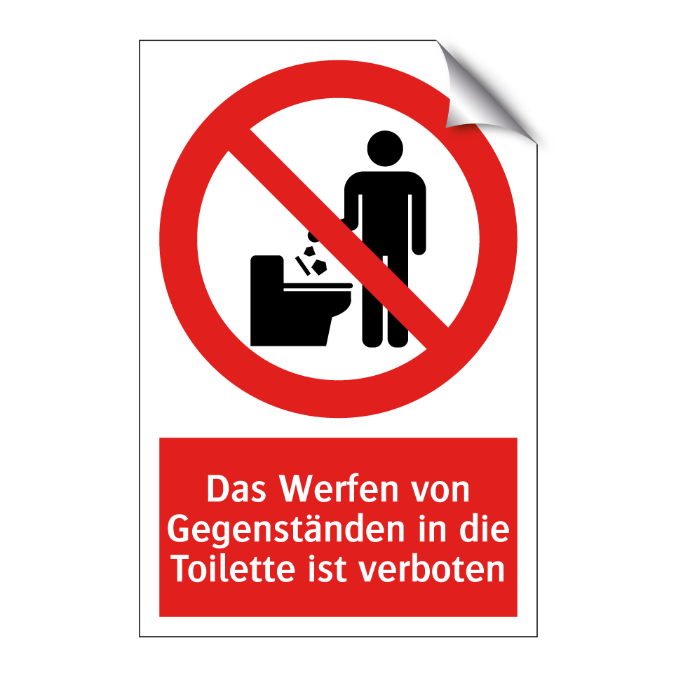 Verbotsschild mit dem Text Das Werfen von Gegenständen in die Toilette ist verboten