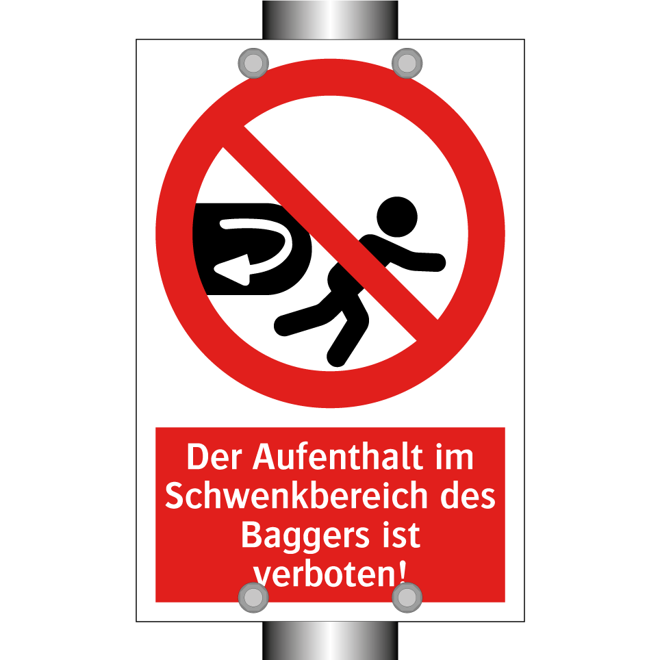 Verbotsschild mit dem Text Der Aufenthalt im Schwenkbereich des Baggers ist verboten!
