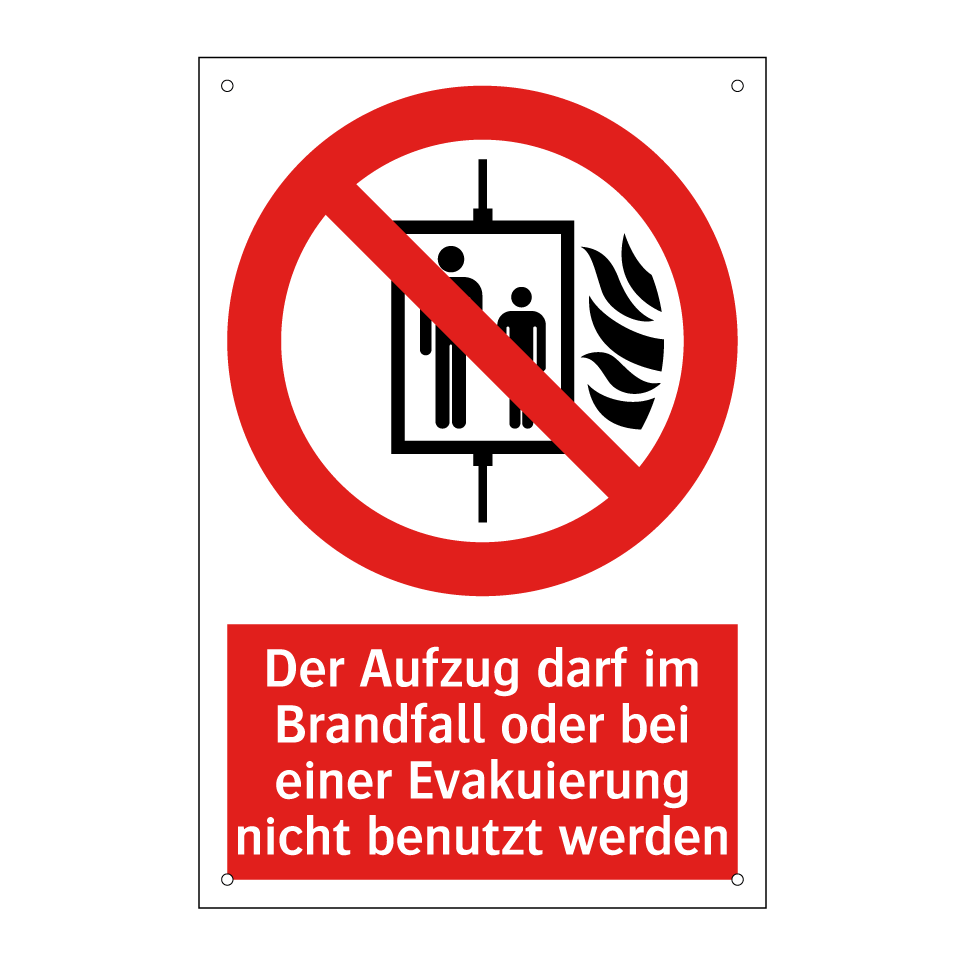 Verbotsschild mit dem Text Der Aufzug darf im Brandfall oder bei einer Evakuierung nicht benutzt werden
