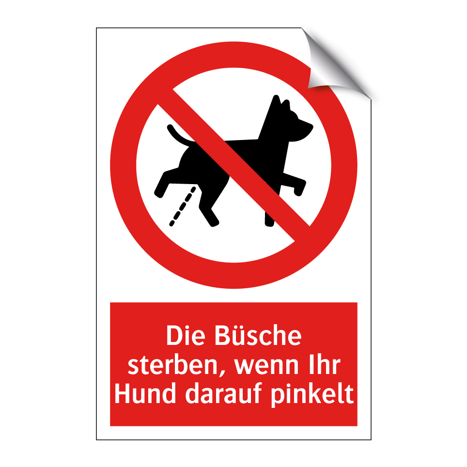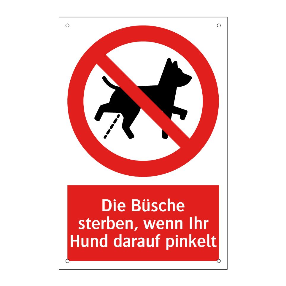 Verbotsschild mit dem Text Die Büsche sterben, wenn Ihr Hund darauf pinkelt