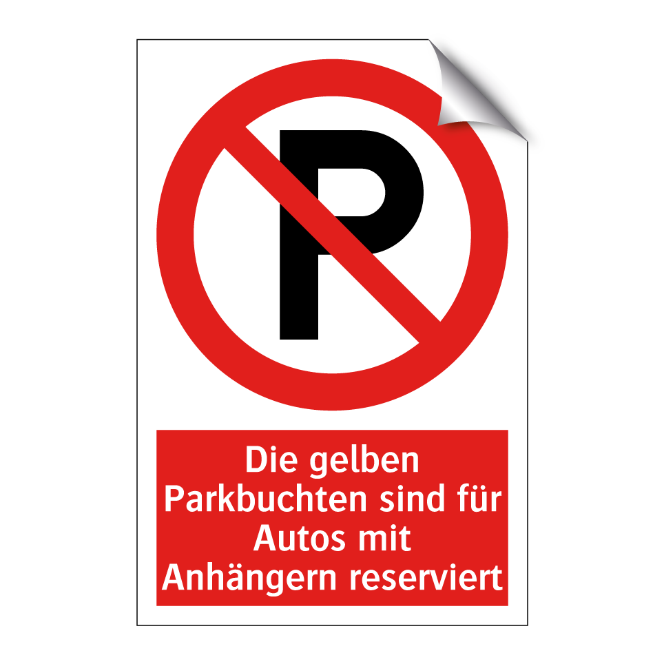 Verbotsschild mit dem Text Die gelben Parkbuchten sind für Autos mit Anhängern reserviert