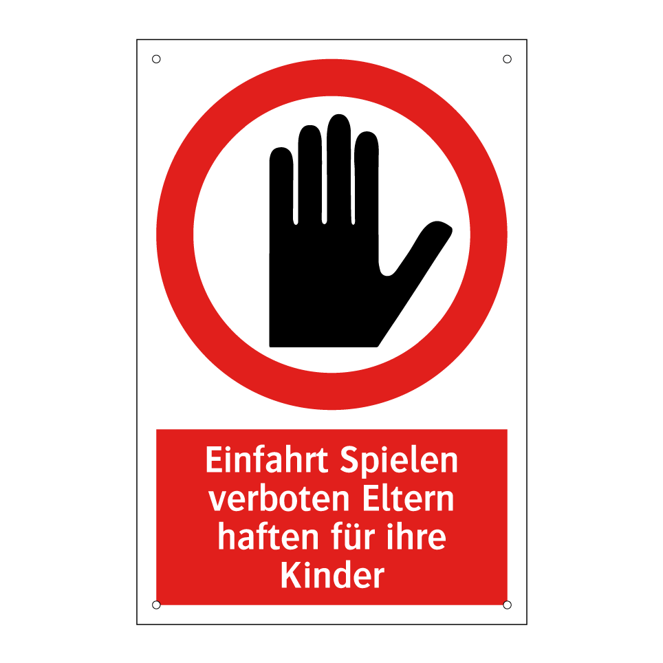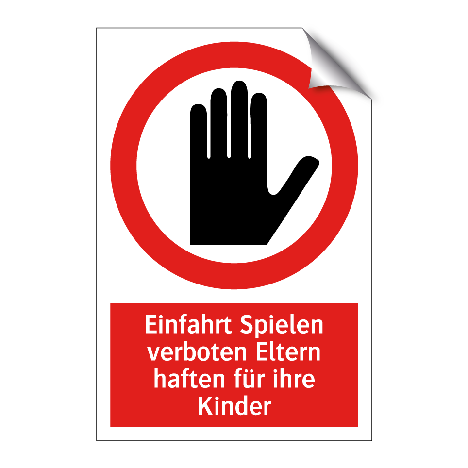 Verbotsschild mit dem Text Einfahrt Spielen verboten Eltern haften für ihre Kinder