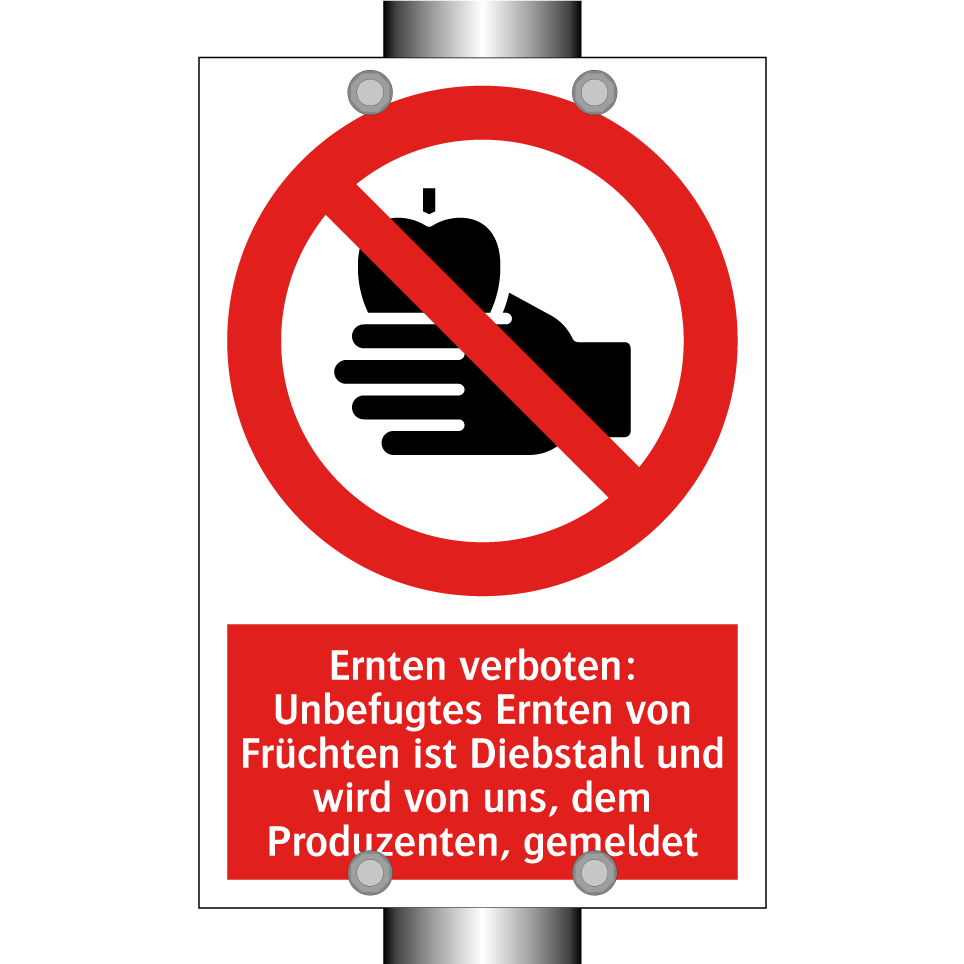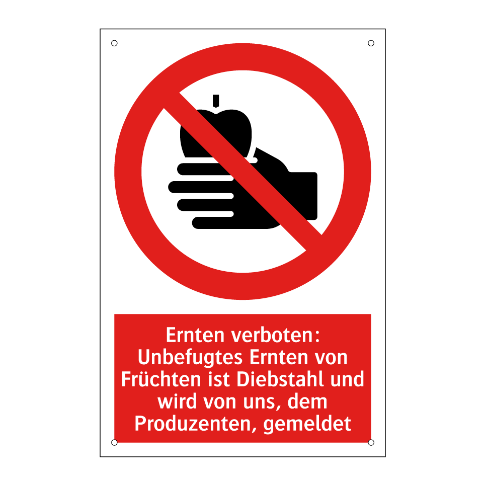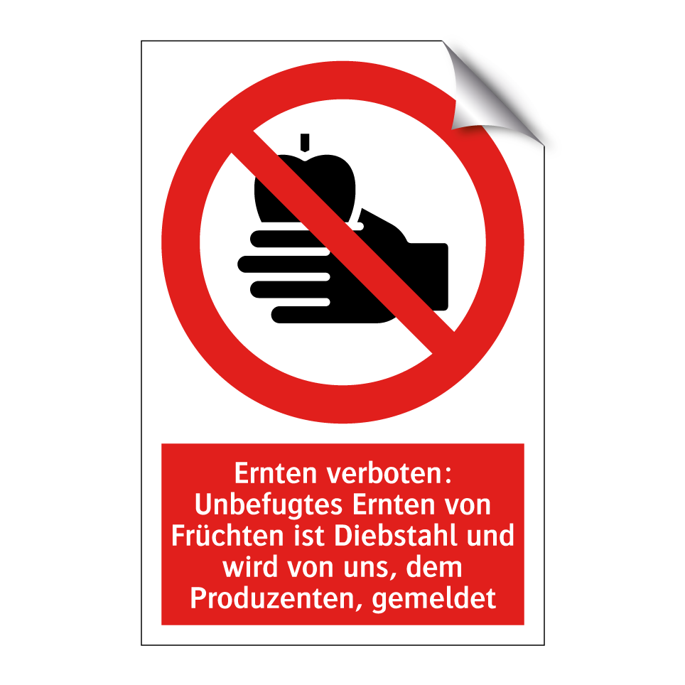 Verbotsschild mit dem Text Ernten verboten: Unbefugtes Ernten von Früchten ist Diebstahl und wird von uns, dem Produzenten, gemeldet