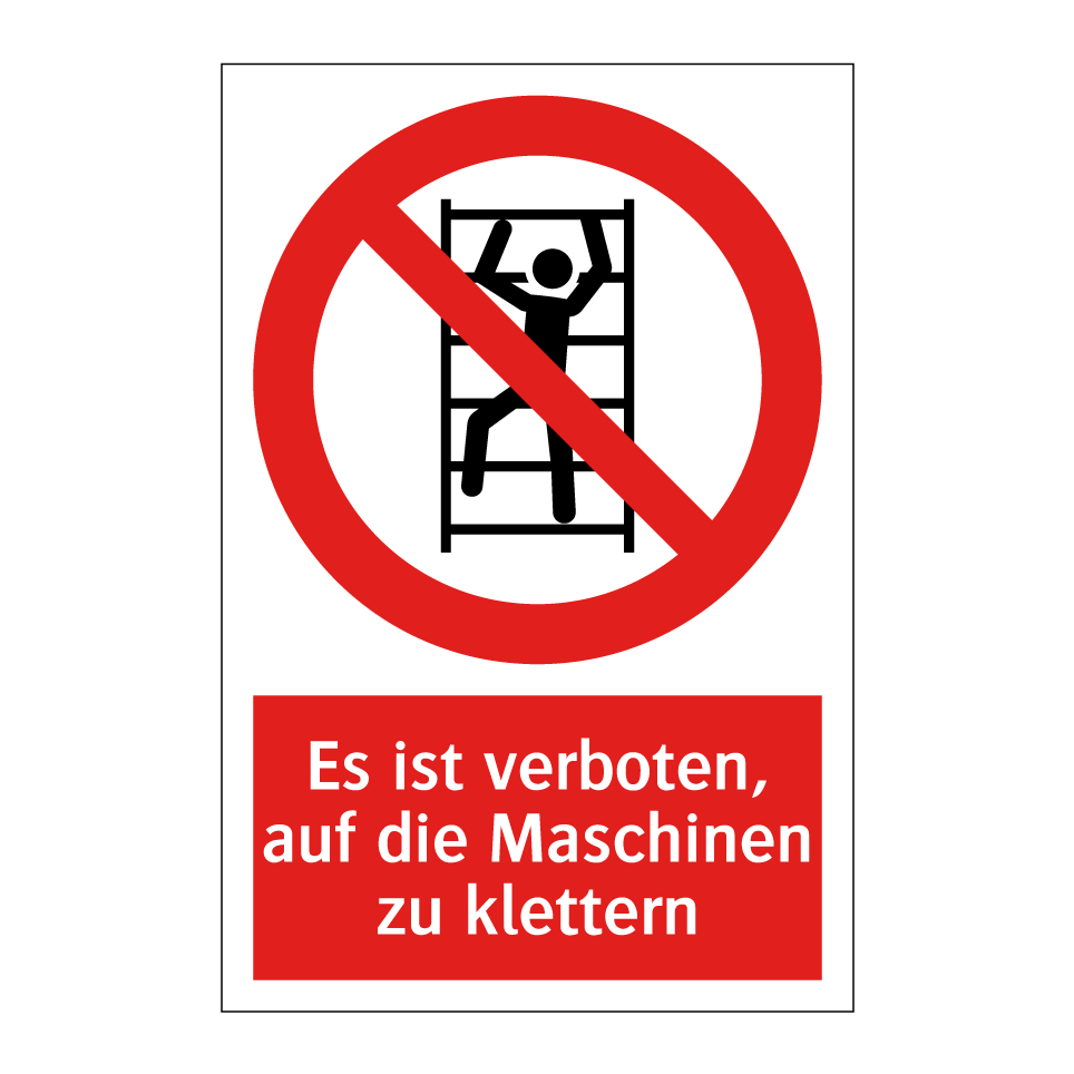 Verbotsschild mit dem Text Es ist verboten, auf die Maschinen zu klettern