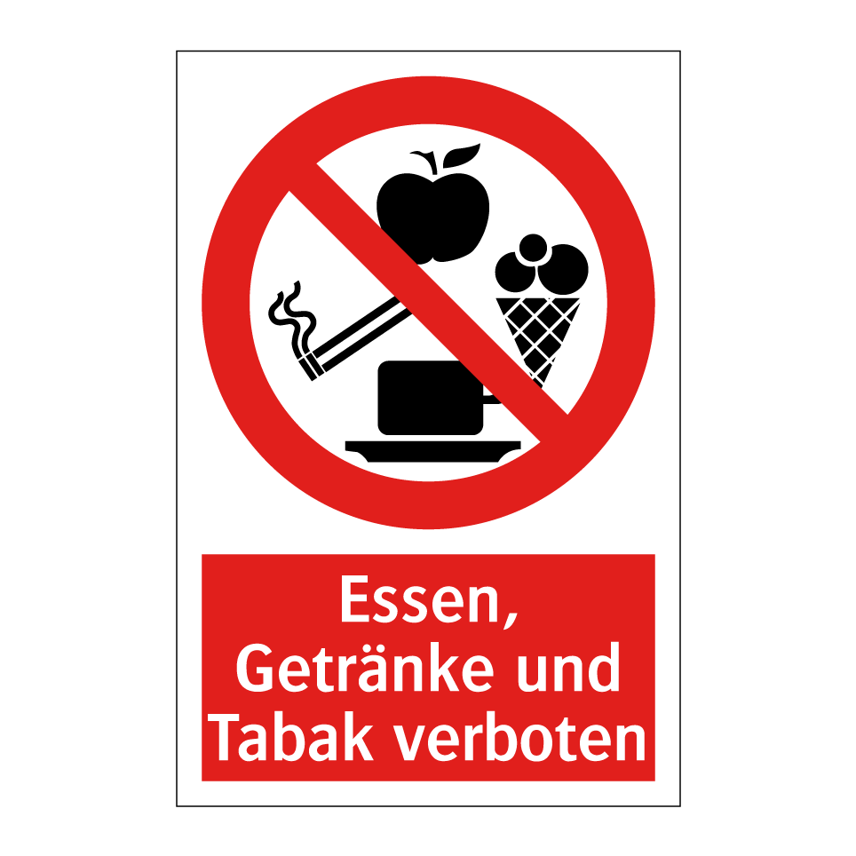 Verbotsschild mit dem Text Essen, Getränke und Tabak verboten