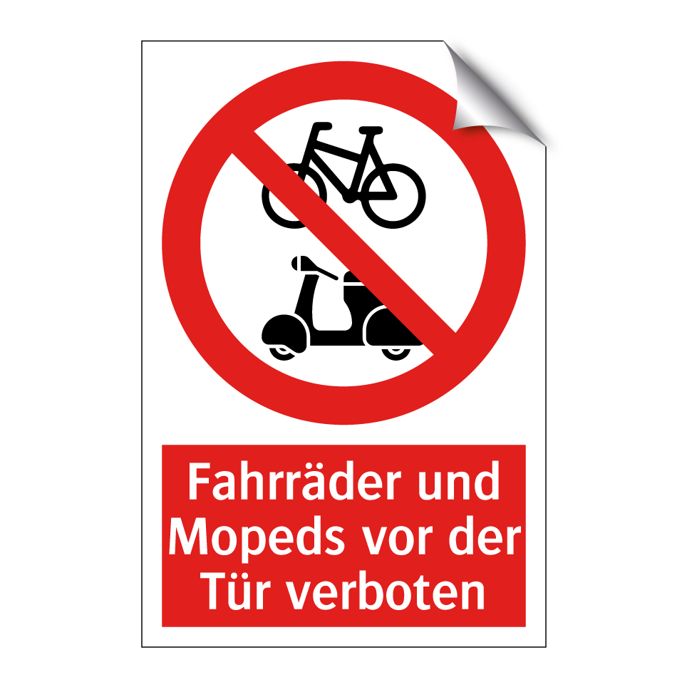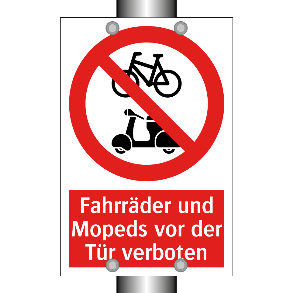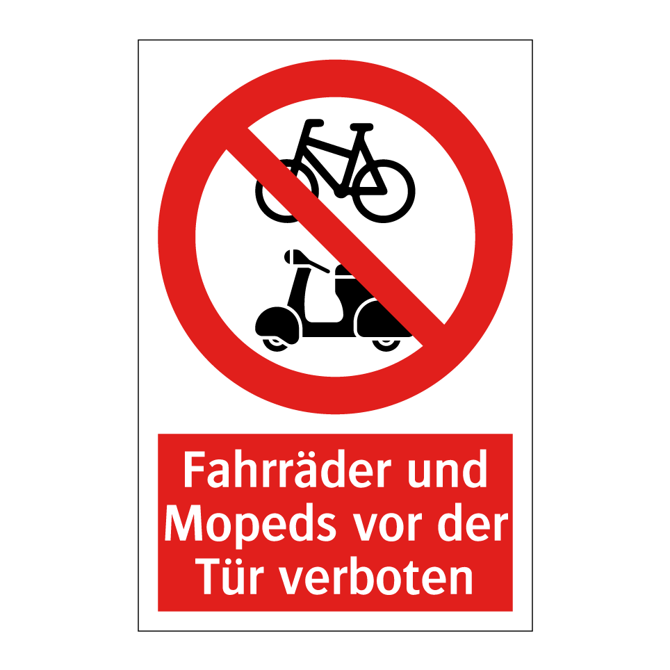 Verbotsschild mit dem Text Fahrräder und Mopeds vor der Tür verboten