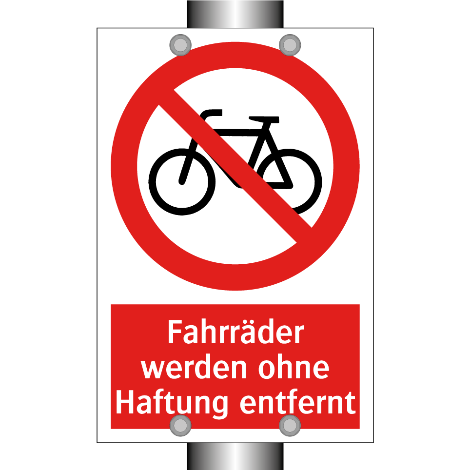 Verbotsschild mit dem Text Fahrräder werden ohne Haftung entfernt