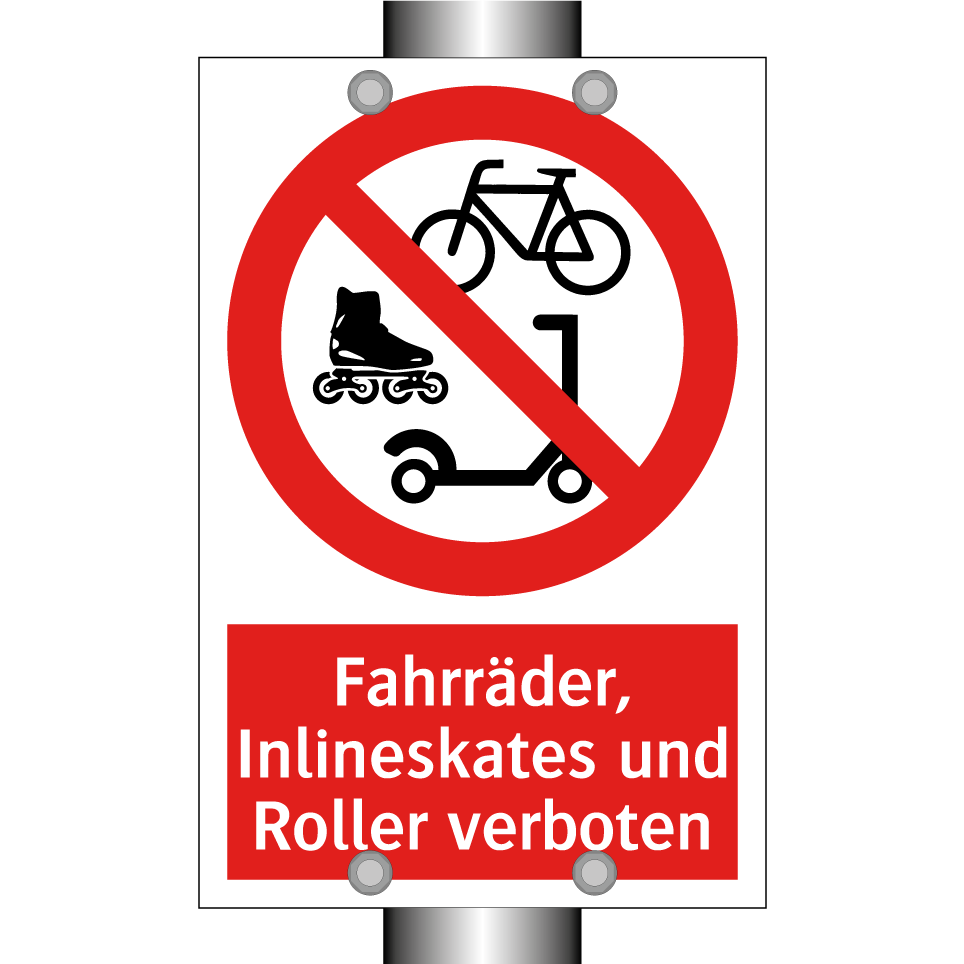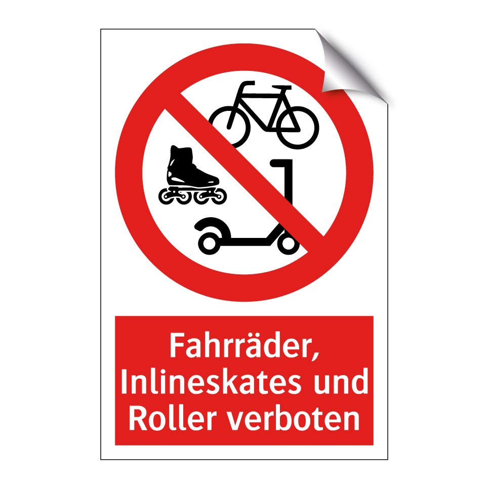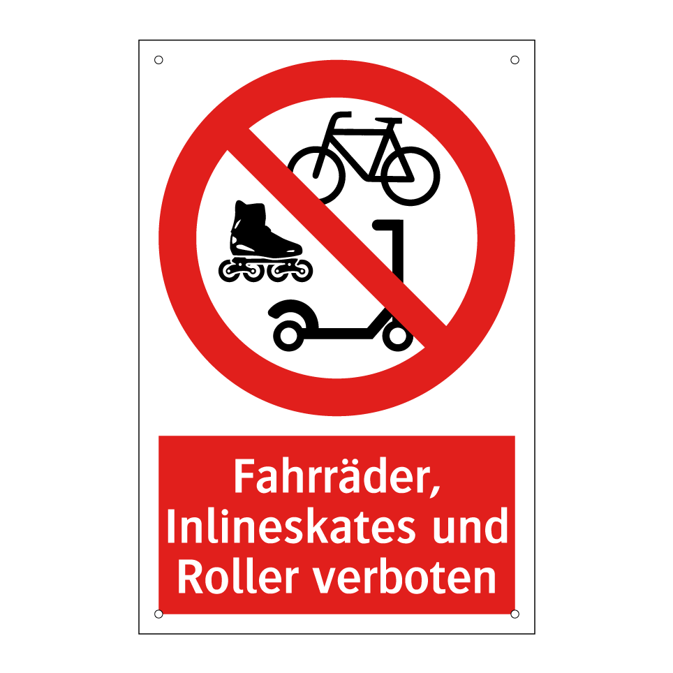 Verbotsschild mit dem Text Fahrräder, Inlineskates und Roller verboten