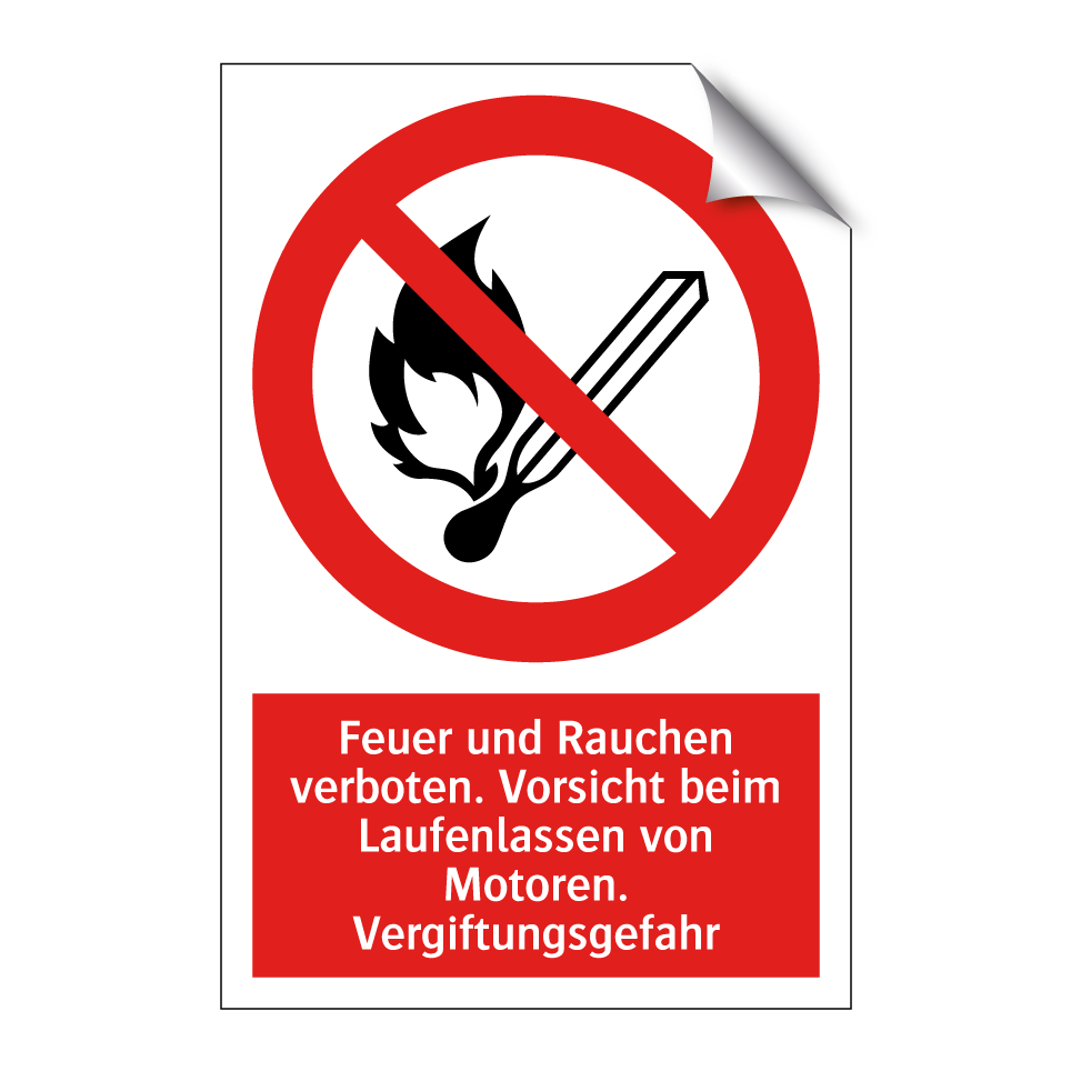 Verbotsschild mit dem Text Feuer und Rauchen verboten. Vorsicht beim Laufenlassen von Motoren. Vergiftungsgefahr