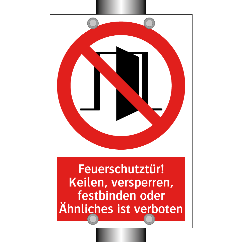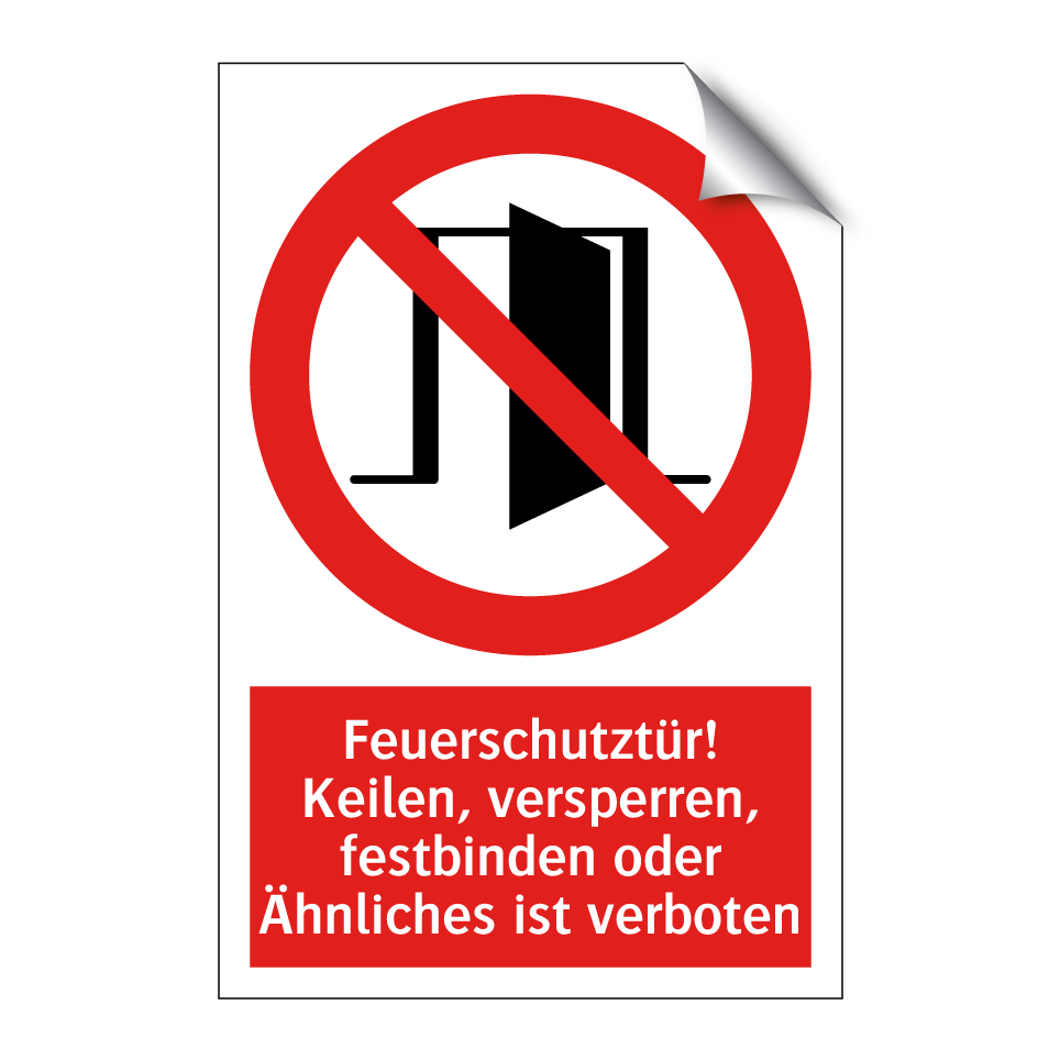 Verbotsschild mit dem Text Feuerschutztür! Keilen, versperren, festbinden oder Ähnliches ist verboten