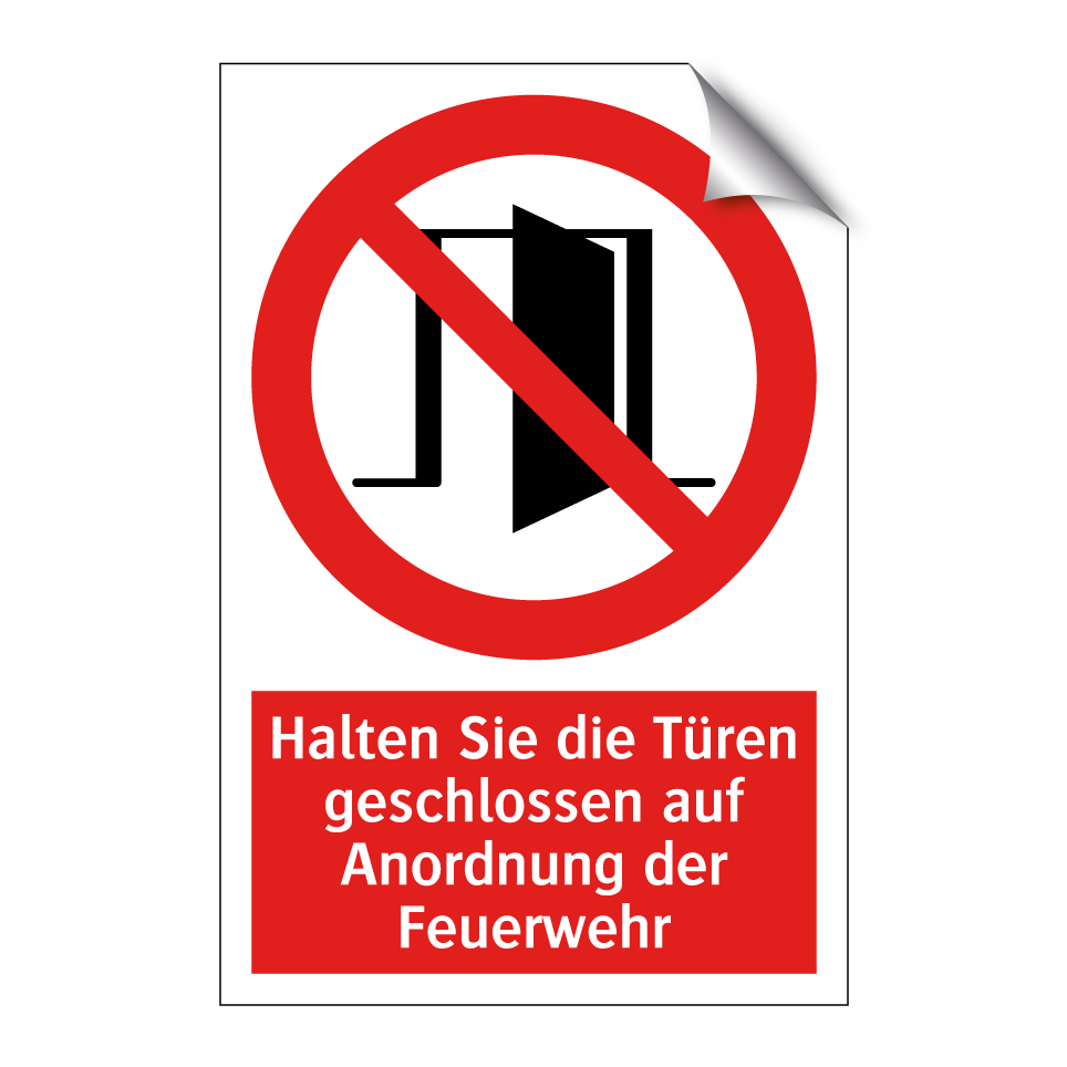 Verbotsschild mit dem Text Halten Sie die Türen geschlossen auf Anordnung der Feuerwehr
