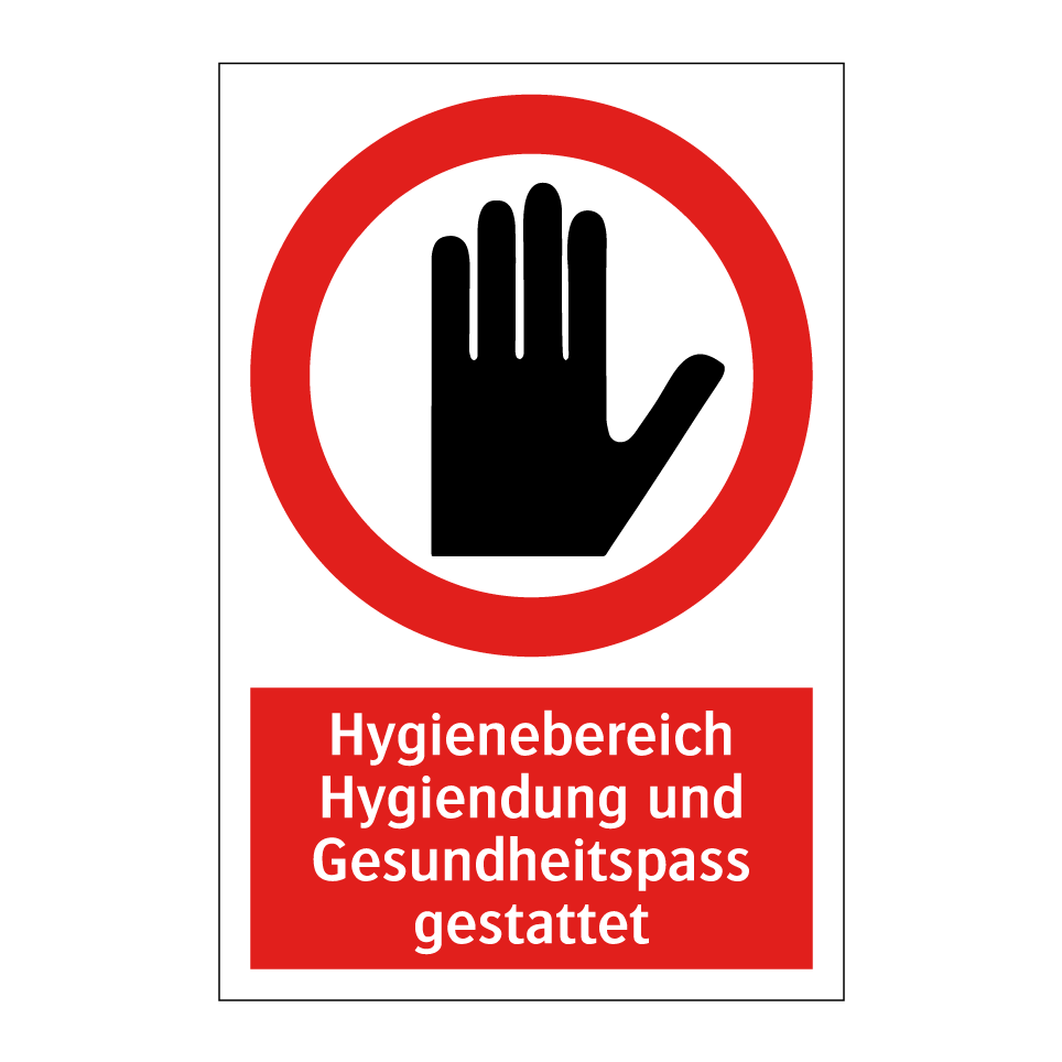 Verbotsschild mit dem Text Hygienebereich Hygiendung und Gesundheitspass gestattet