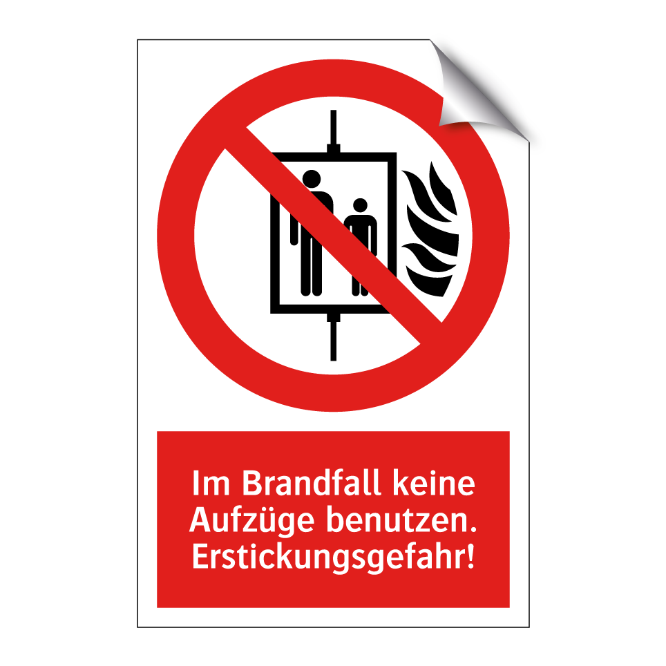 Verbotsschild mit dem Text Im Brandfall keine Aufzüge benutzen. Erstickungsgefahr!