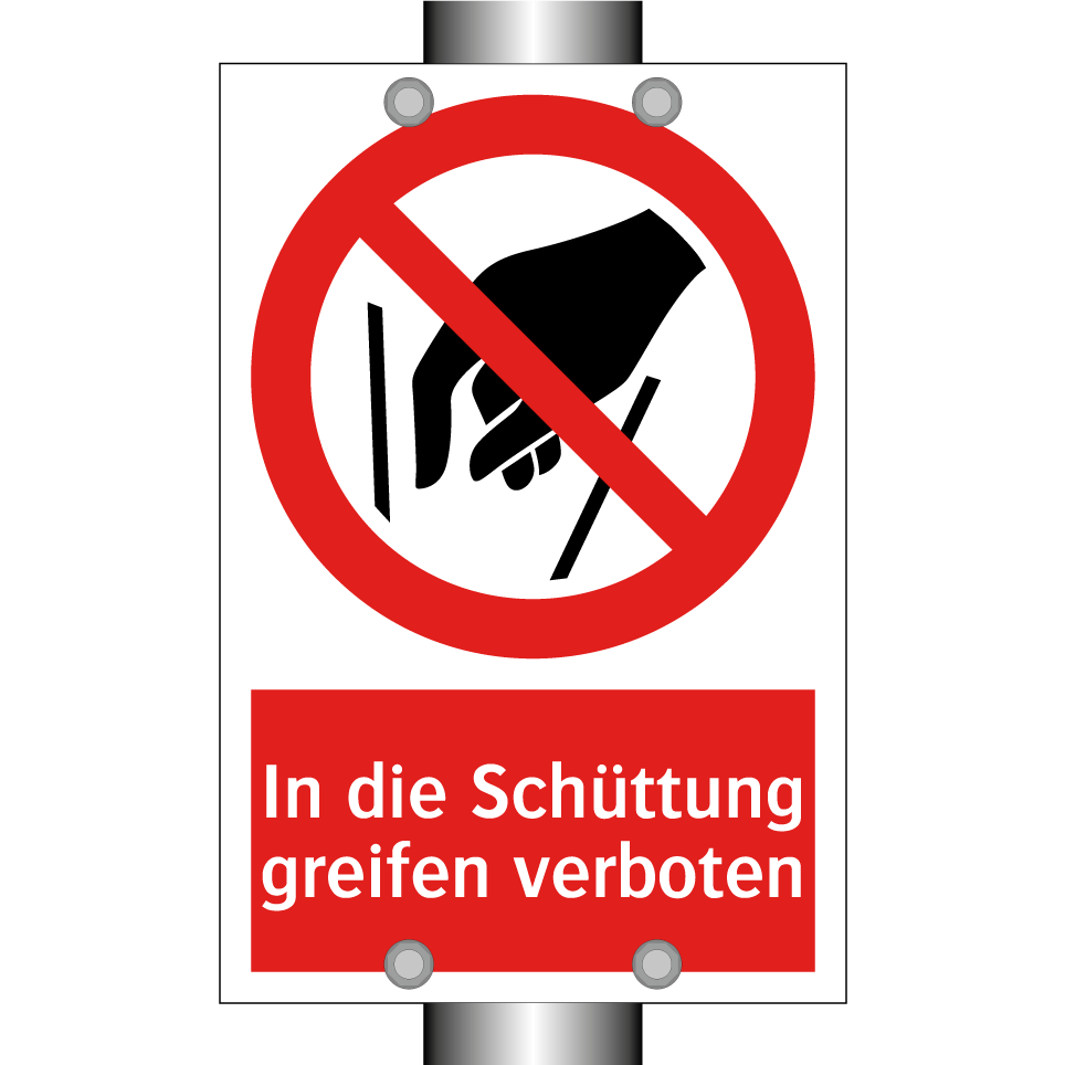 Verbotsschild mit dem Text In die Schüttung greifen verboten