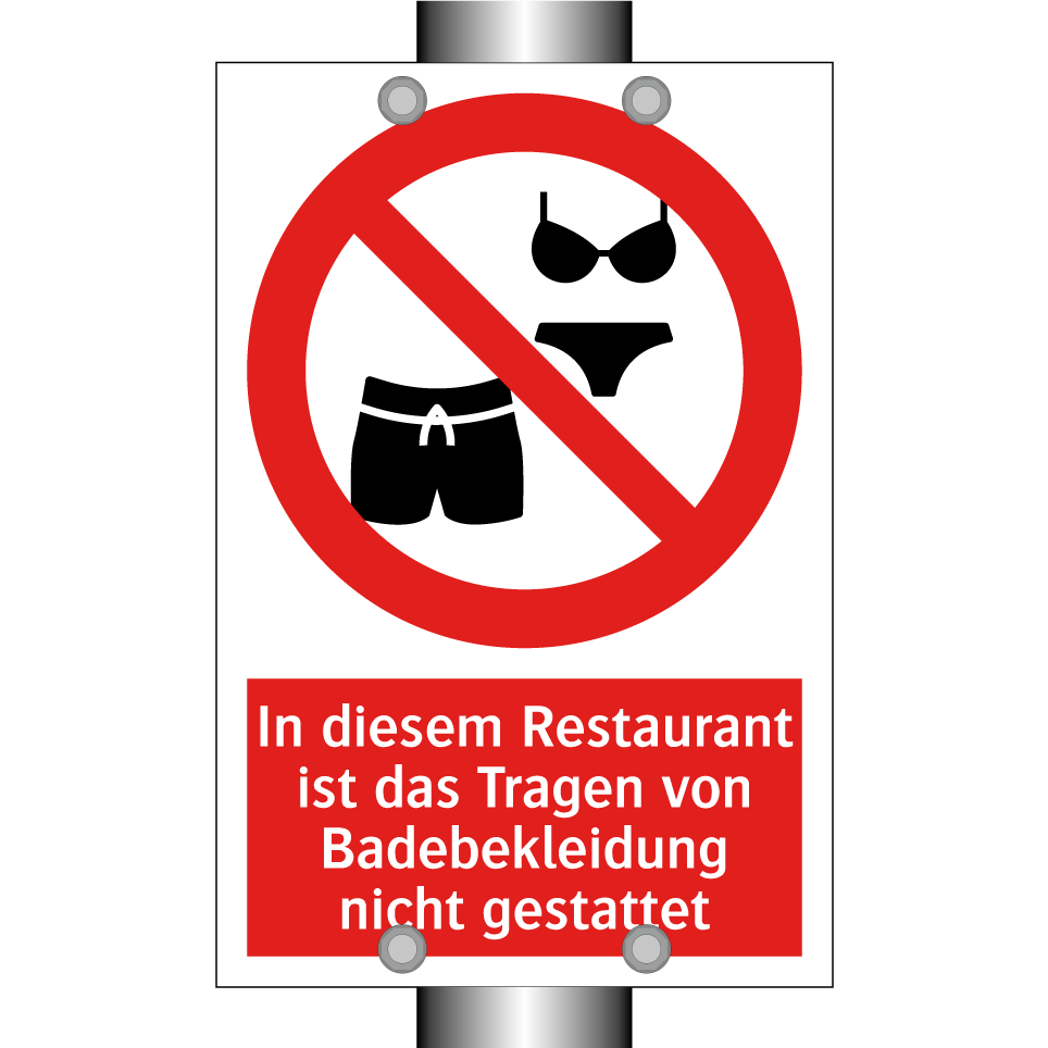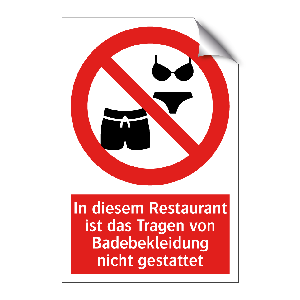 Verbotsschild mit dem Text In diesem Restaurant ist das Tragen von Badebekleidung nicht gestattet