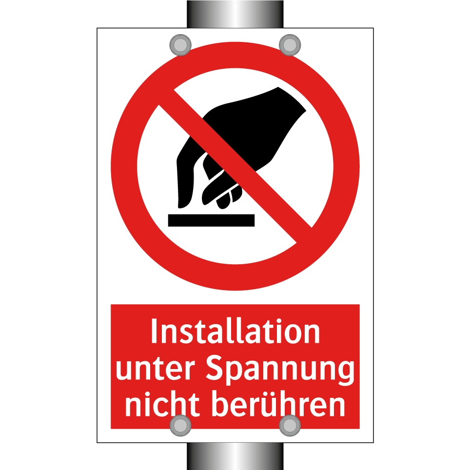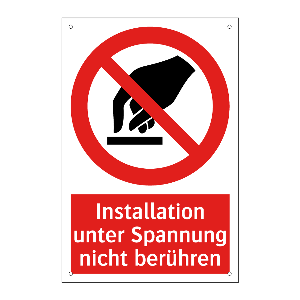 Verbotsschild mit dem Text Installation unter Spannung nicht berühren