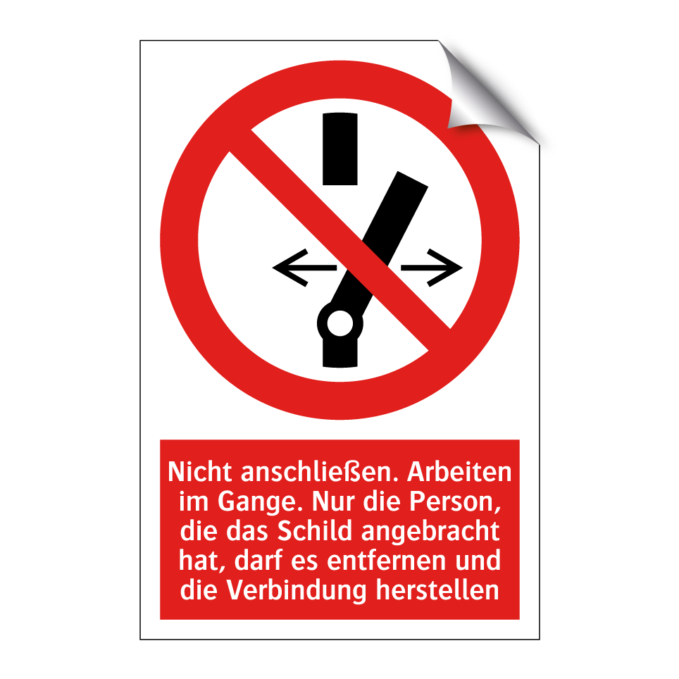 Verbotsschild mit dem Text Nicht anschließen. Arbeiten im Gange. Nur die Person, die das Schild angebracht hat, darf es entfernen und die Verbindung herstellen