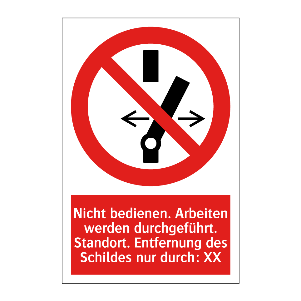 Verbotsschild mit dem Text Nicht bedienen. Arbeiten werden durchgeführt. Standort. Entfernung des Schildes nur durch: XX