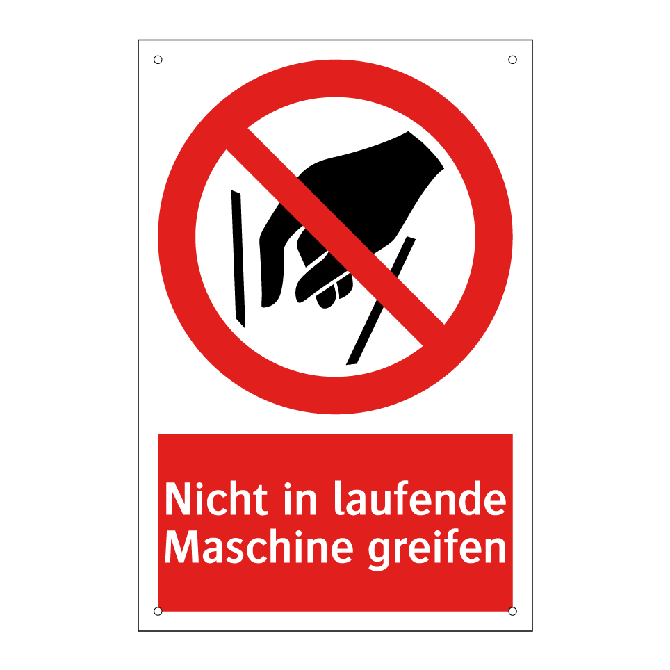 Verbotsschild mit dem Text Nicht in laufende Maschine greifen