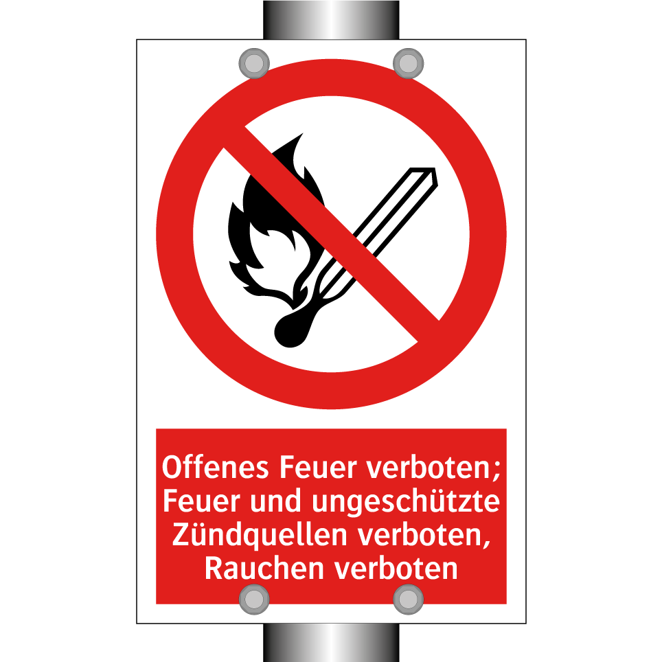 Verbotsschild mit dem Text Offenes Feuer verboten; Feuer und ungeschützte Zündquellen verboten, Rauchen verboten