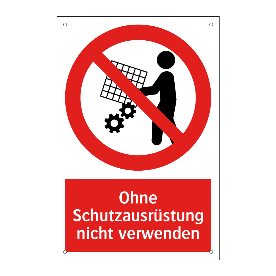 Verbotsschild mit dem Text Ohne Schutzausrüstung nicht verwenden