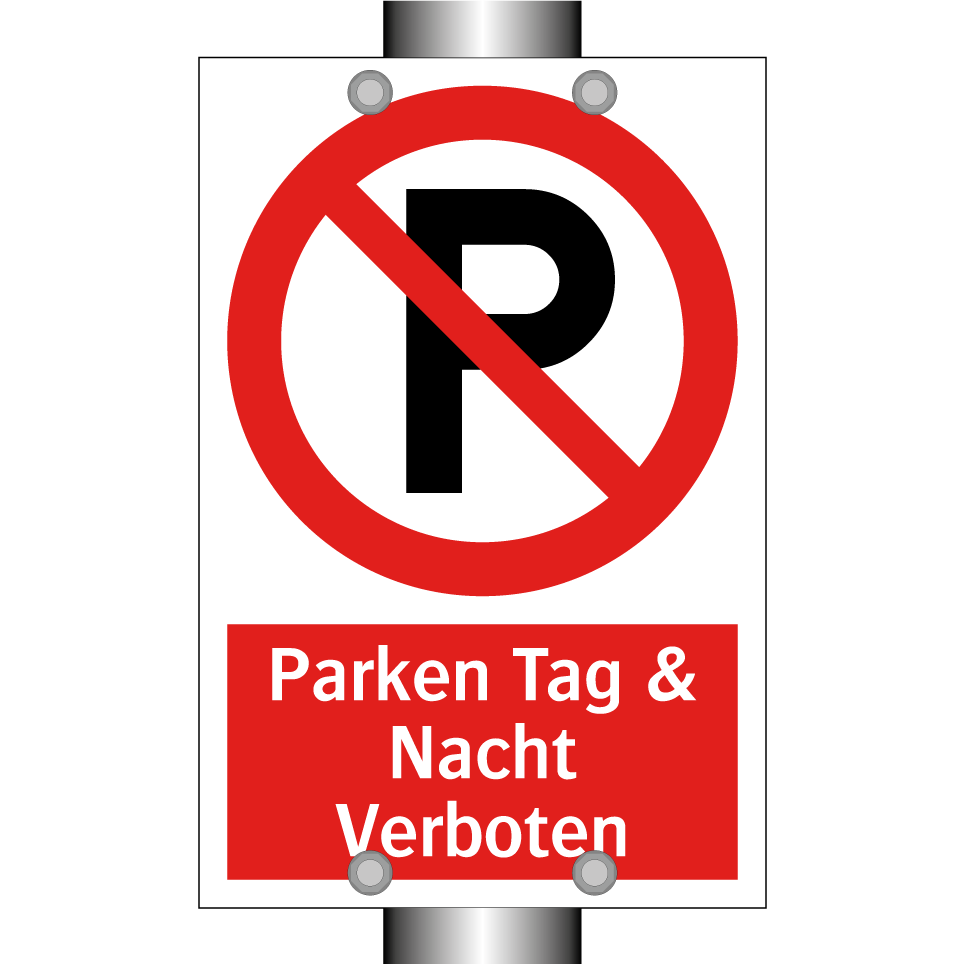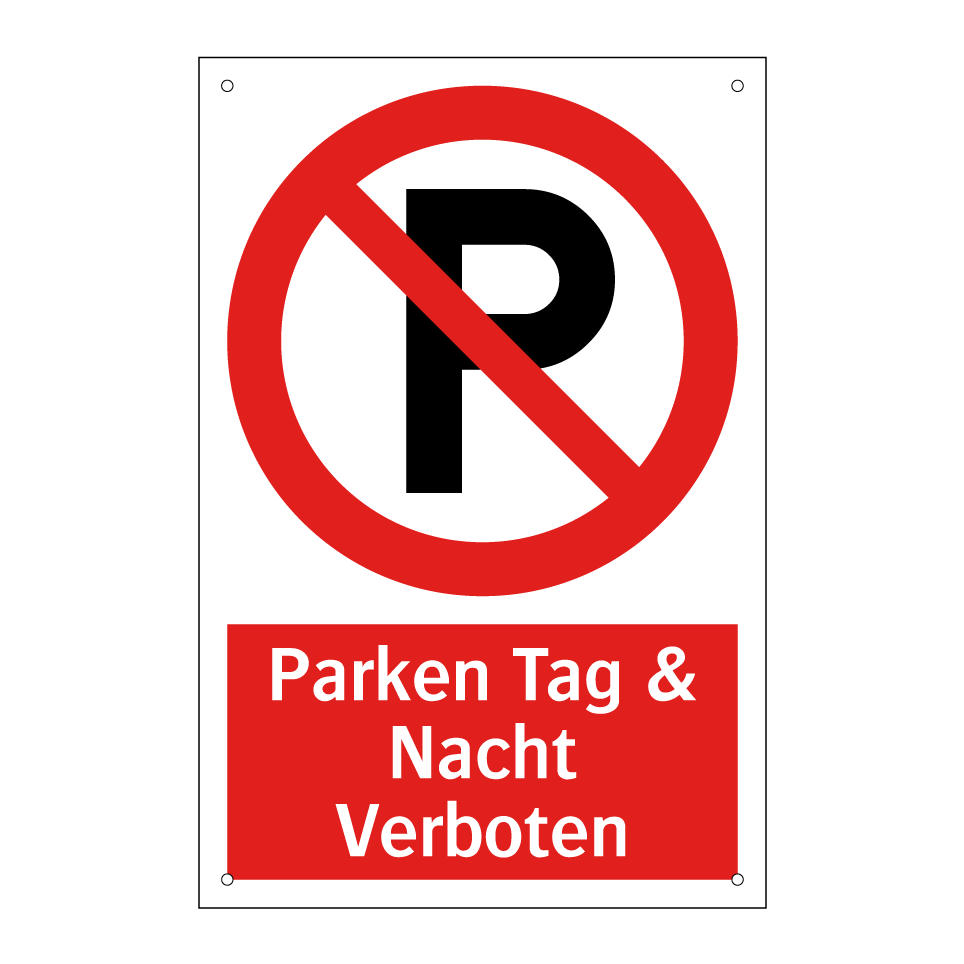 Verbotsschild mit dem Text Parken Tag & Nacht Verboten