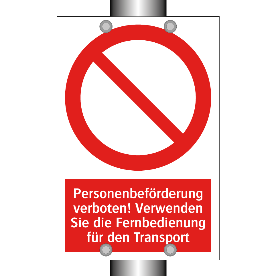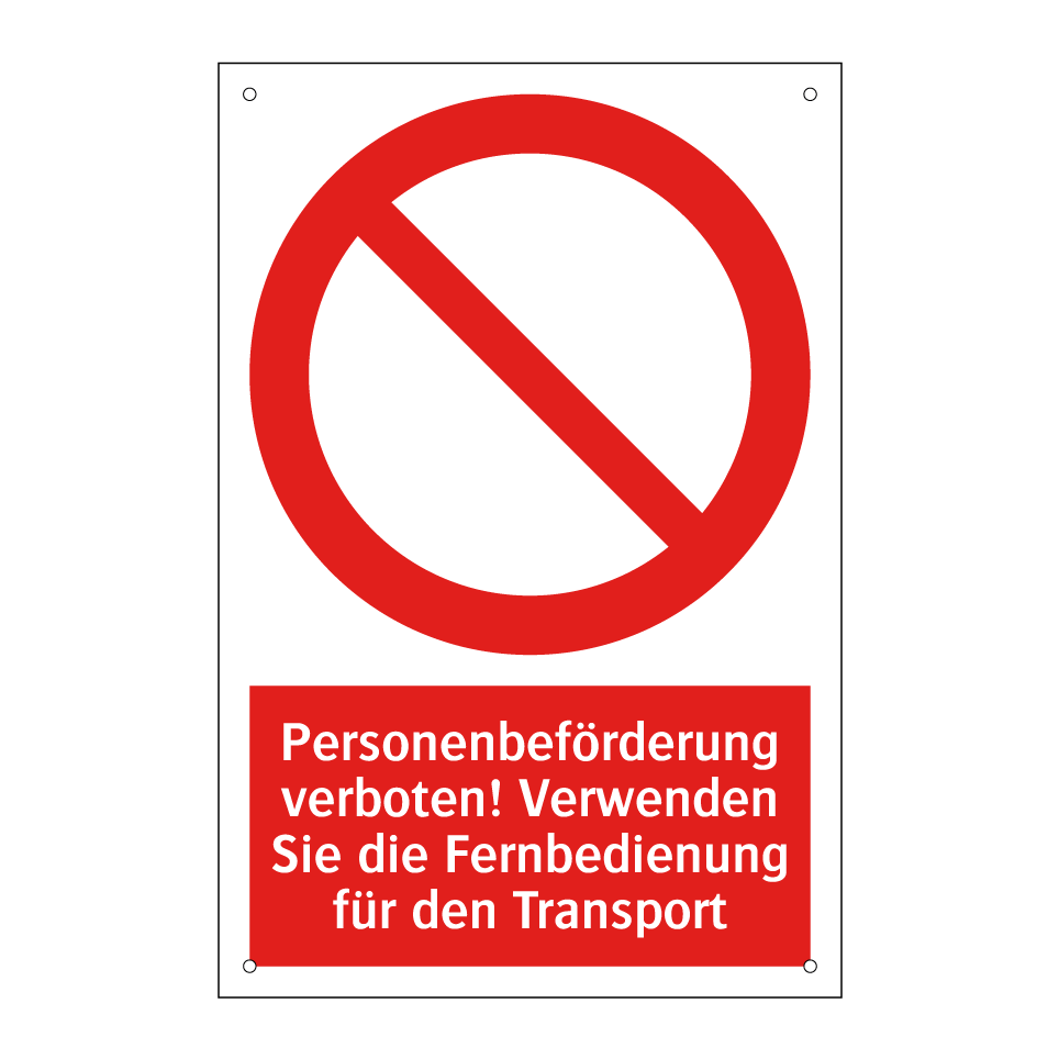 Verbotsschild mit dem Text Personenbeförderung verboten! Verwenden Sie die Fernbedienung für den Transport