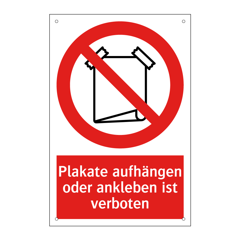 Diese auffällige Verbotsschild mit rotem Hintergrund und weißer Schrift ist ideal, um unerwünschtes Anbringen von Plakaten zu verhindern. Die klare Symbolik und der prägnante Text machen es unmissverständlich, dass das Ankleben oder Aufhängen von Plakaten hier nicht gestattet ist. Diese Verbotsschilder sind perfekt für den Einsatz in öffentlichen Bereichen wie Einkaufszentren, Bürogebäuden oder an privaten Grundstücken, wo Ordnung und Sauberkeit gewahrt werden sollen. Platzieren Sie das Schild an gut sichtbaren Stellen, um sicherzustellen, dass die Botschaft effektiv kommuniziert wird. Nutzen Sie dieses Schild, um Ihre Umgebung frei von unerwünschten Plakaten zu halten.