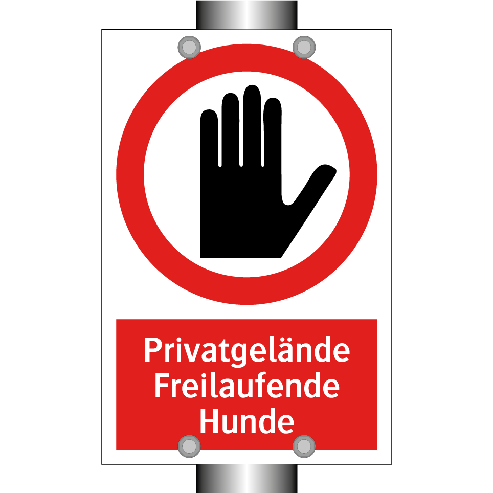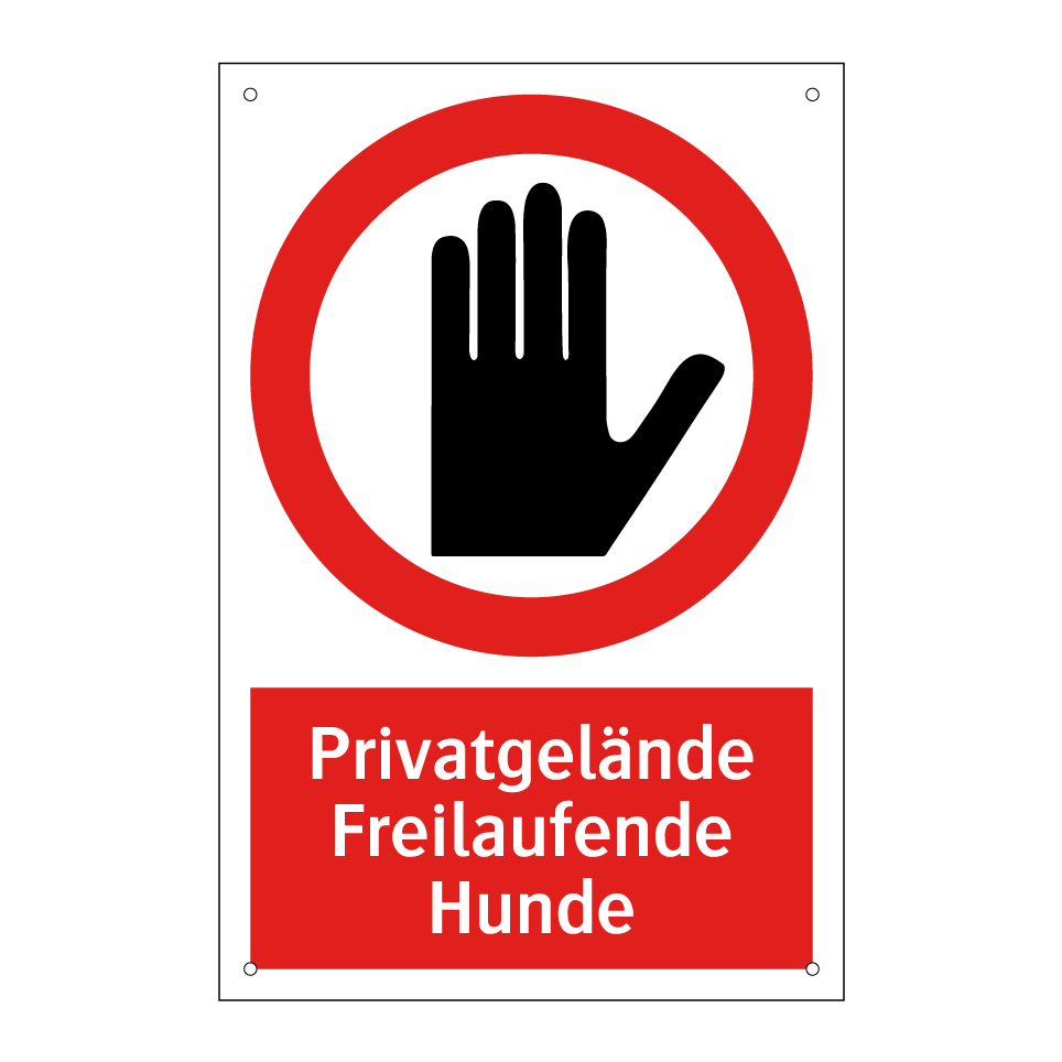Verbotsschild mit dem Text Privatgelände Freilaufende Hunde
