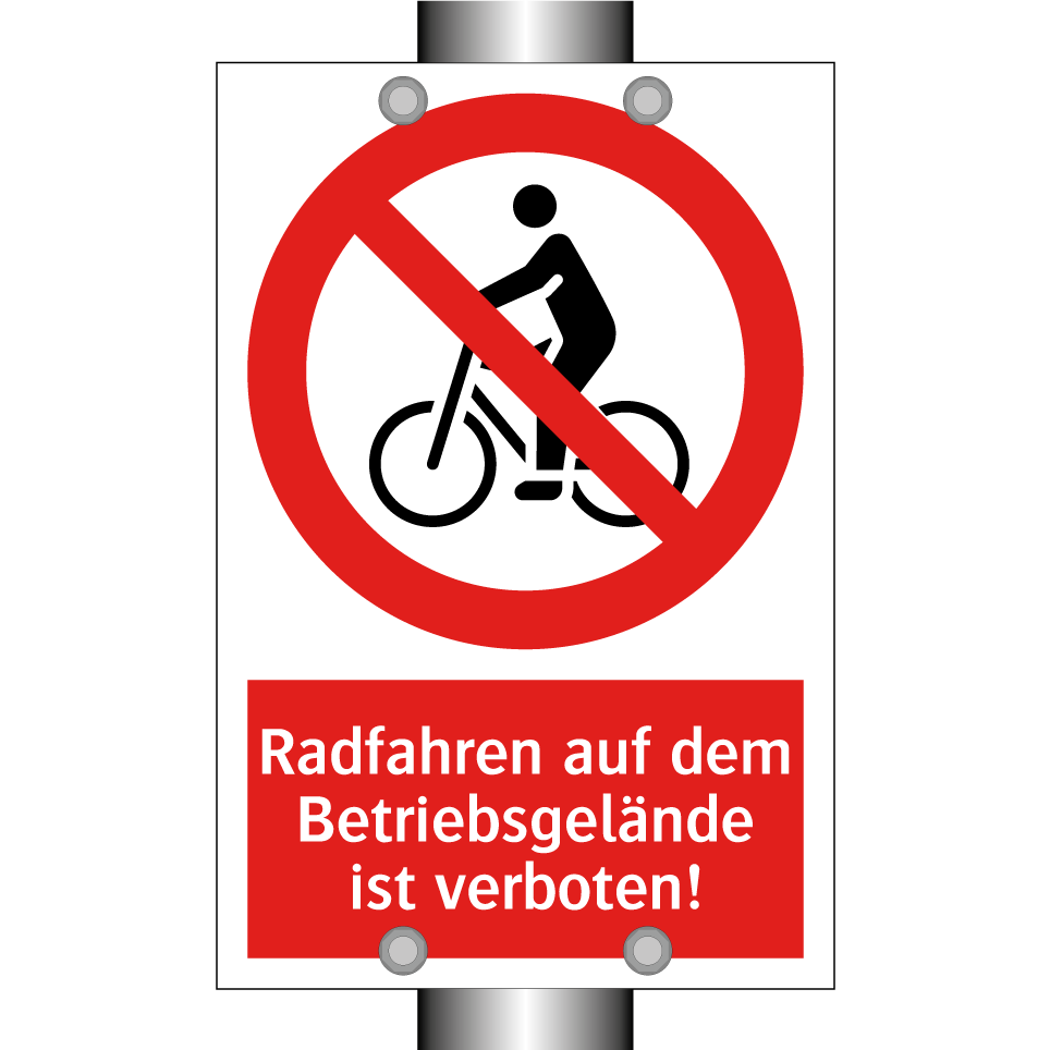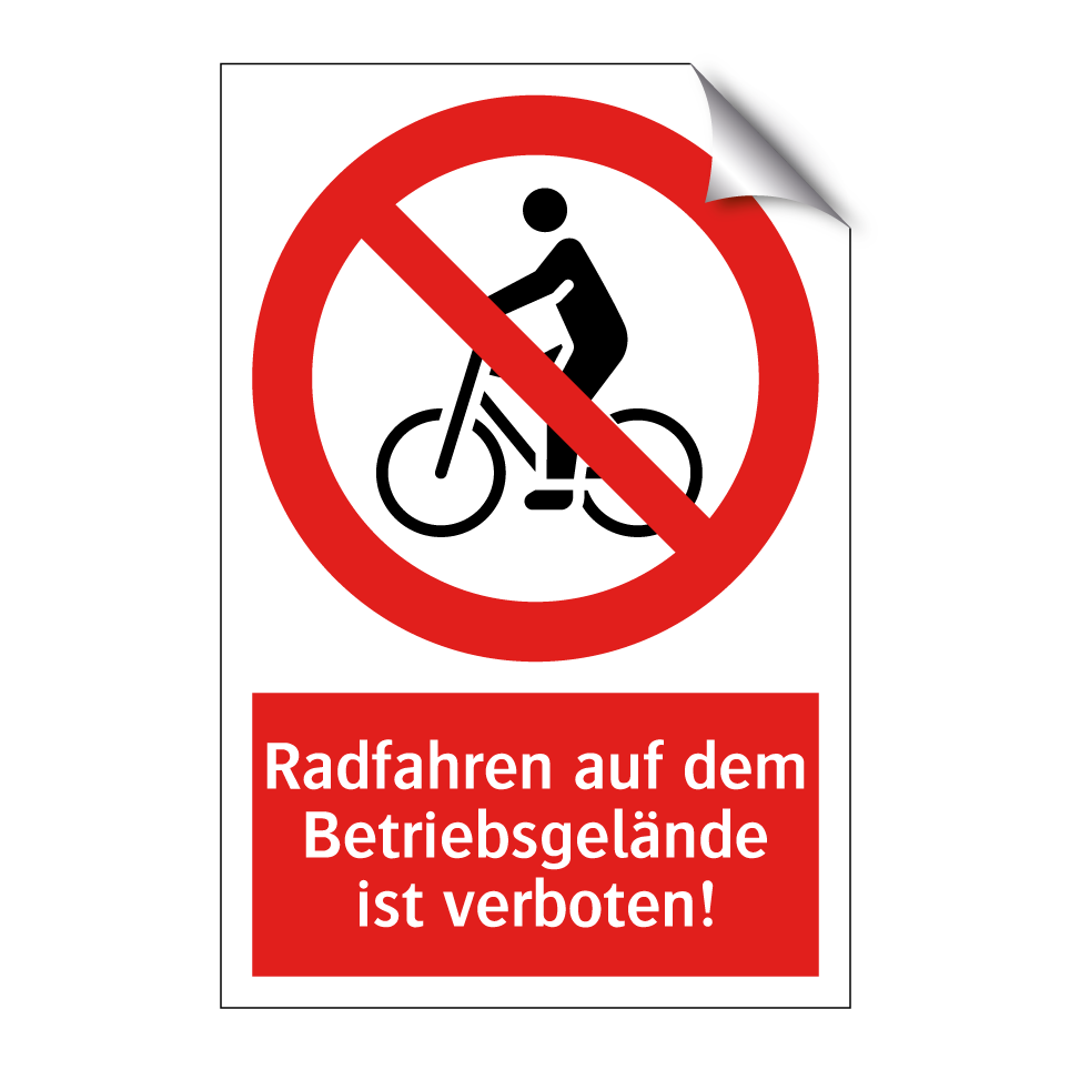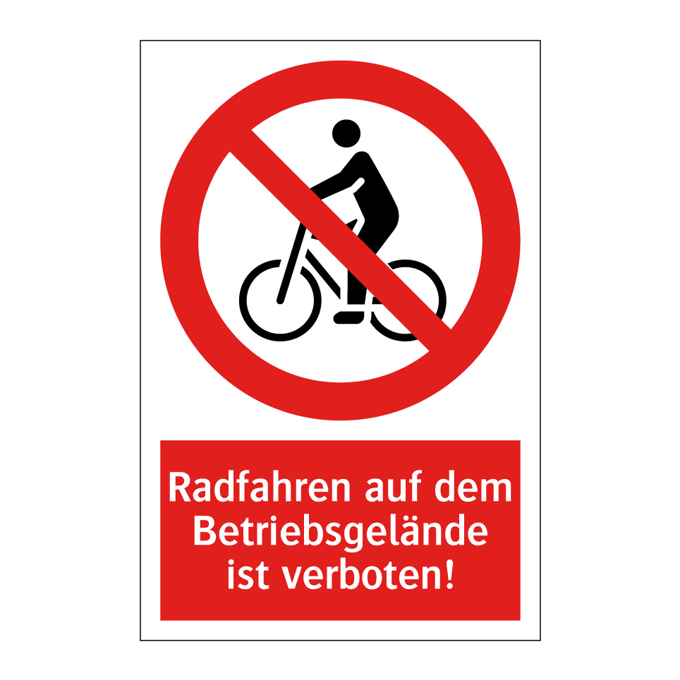 Verbotsschild mit dem Text Radfahren auf dem Betriebsgelände ist verboten!