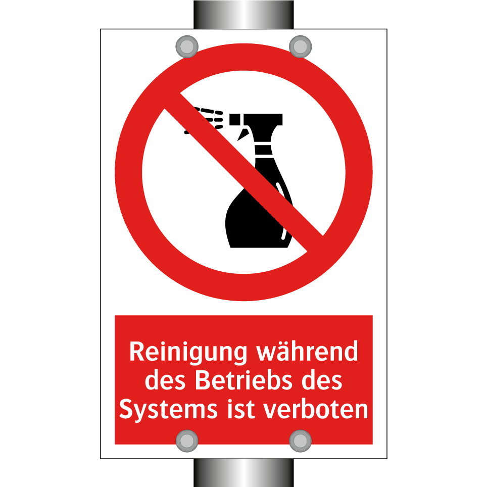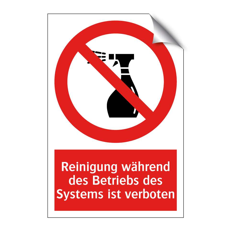Verbotsschild mit dem Text Reinigung während des Betriebs des Systems ist verboten