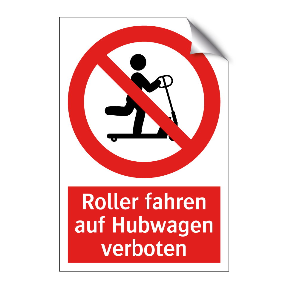 Verbotsschild mit dem Text Roller fahren auf Hubwagen verboten