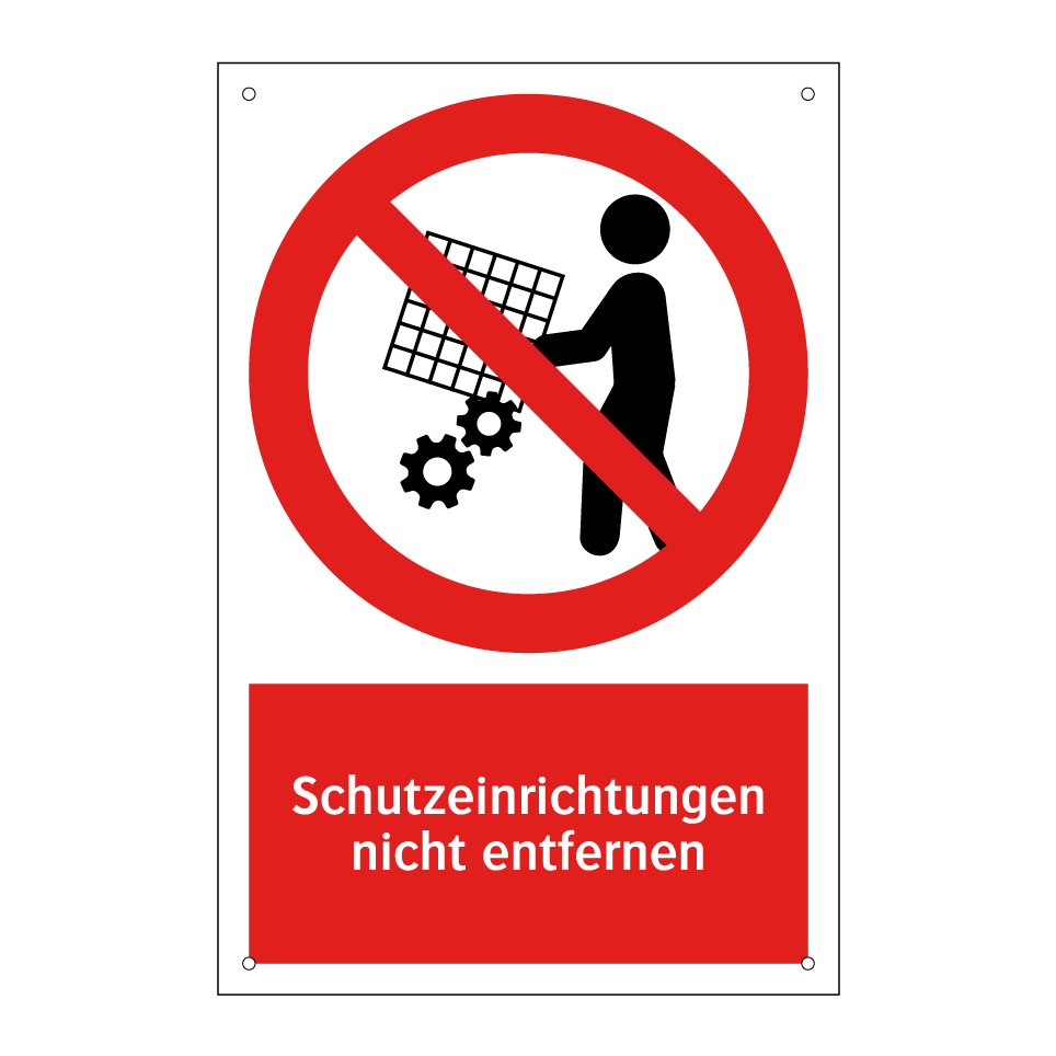 Verbotsschild mit dem Text Schutzeinrichtungen nicht entfernen