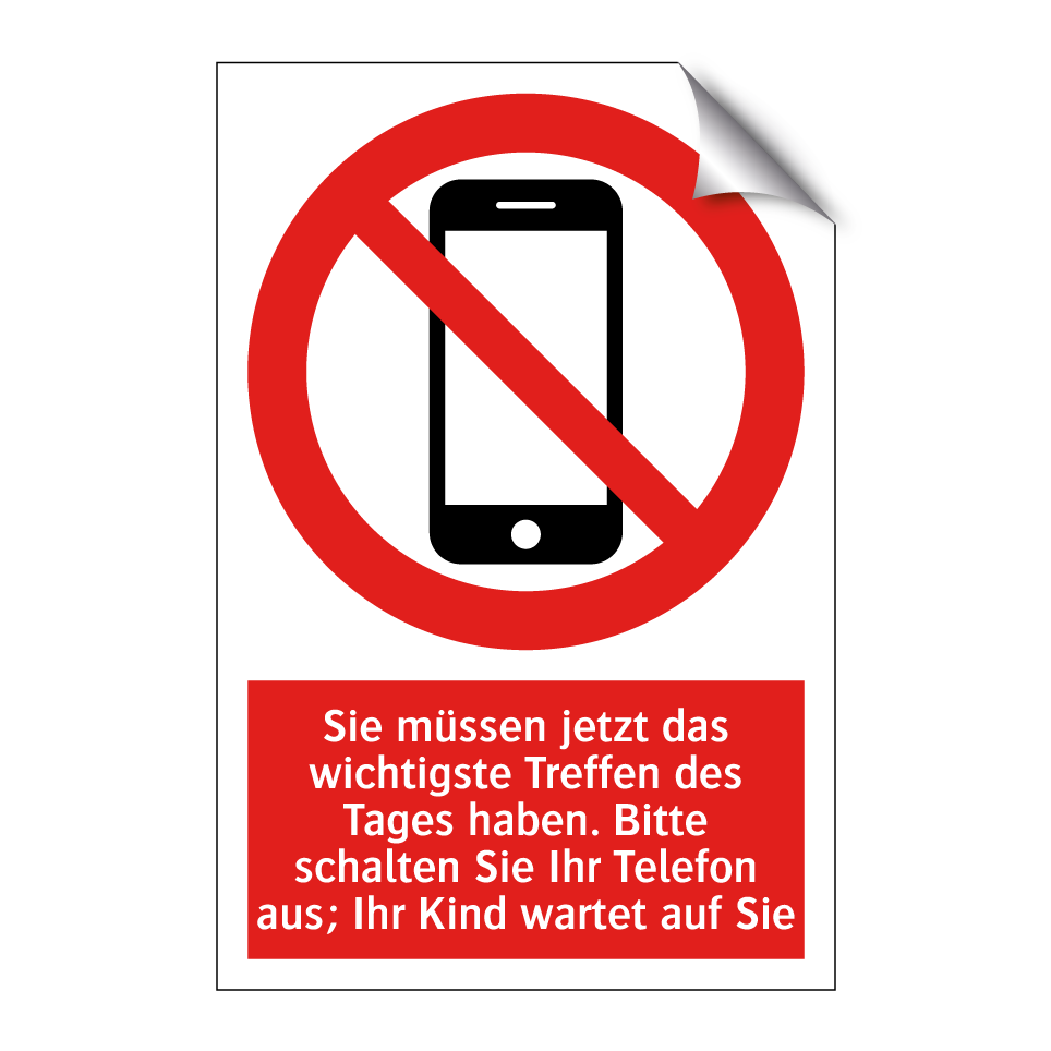 Verbotsschild mit dem Text Sie müssen jetzt das wichtigste Treffen des Tages haben. Bitte schalten Sie Ihr Telefon aus; Ihr Kind wartet auf Sie