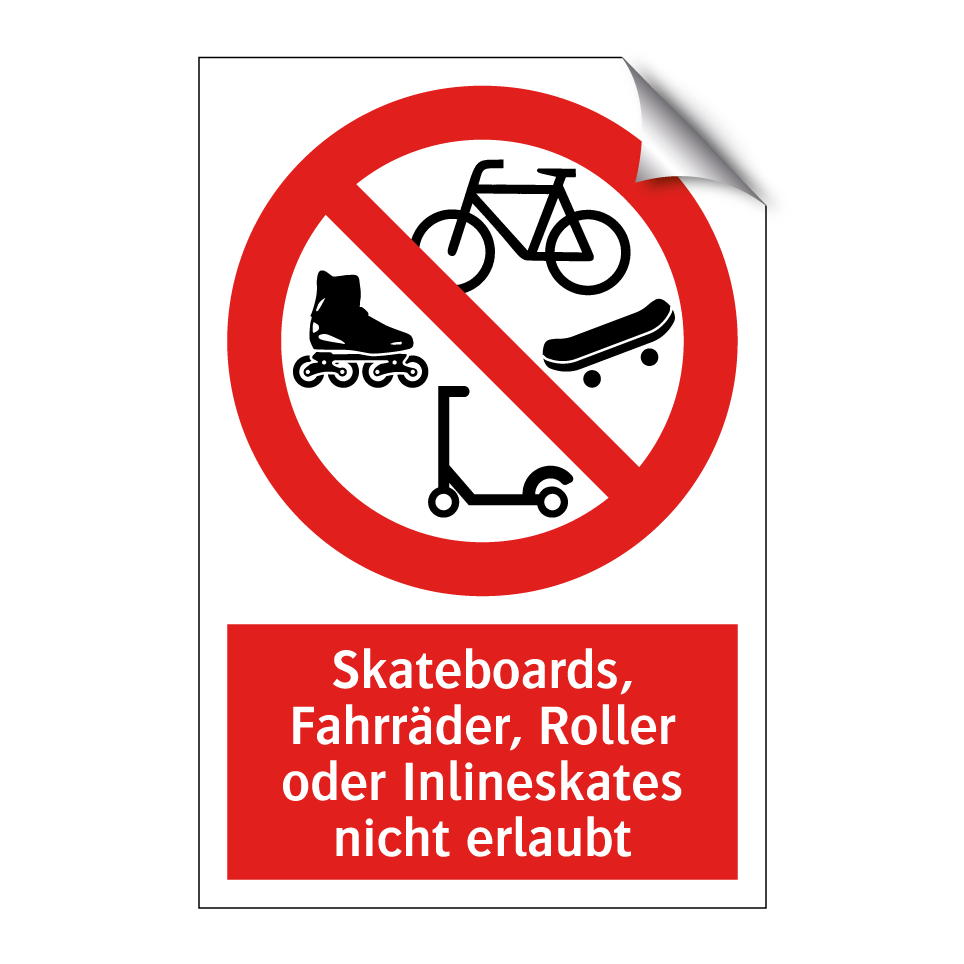 Verbotsschild mit dem Text Skateboards, Fahrräder, Roller oder Inlineskates nicht erlaubt