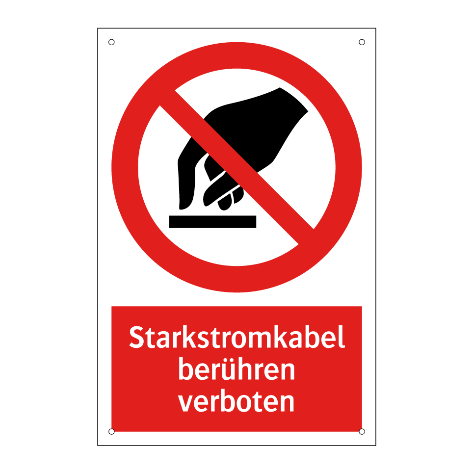Verbotsschild mit dem Text Starkstromkabel berühren verboten