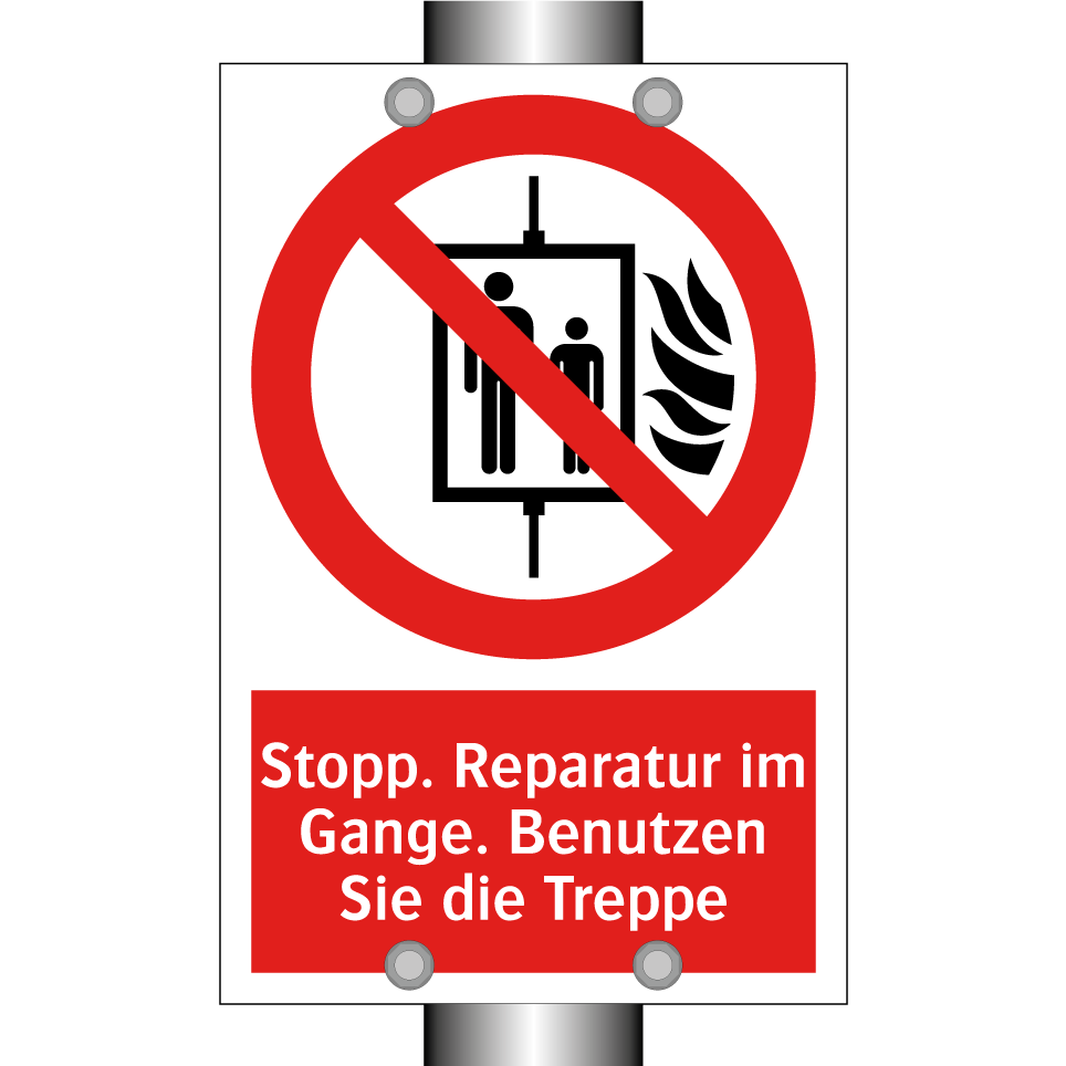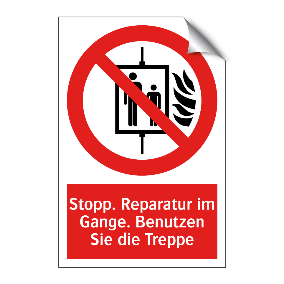 Verbotsschild mit dem Text Stopp. Reparatur im Gange. Benutzen Sie die Treppe