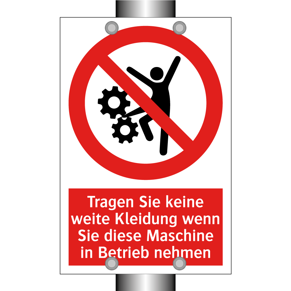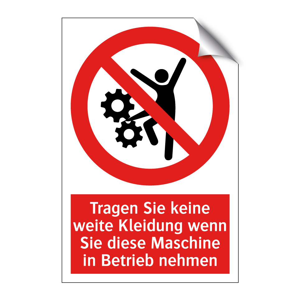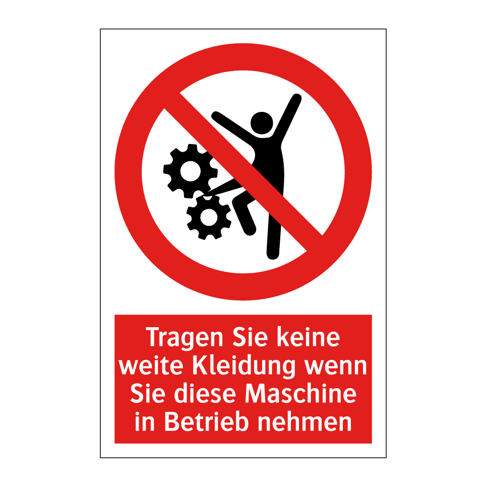 Verbotsschild mit dem Text Tragen Sie keine weite Kleidung wenn Sie diese Maschine in Betrieb nehmen