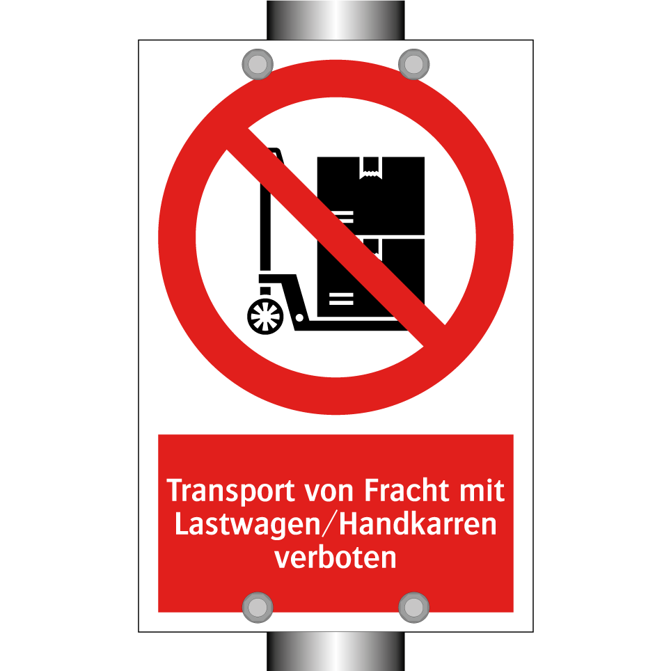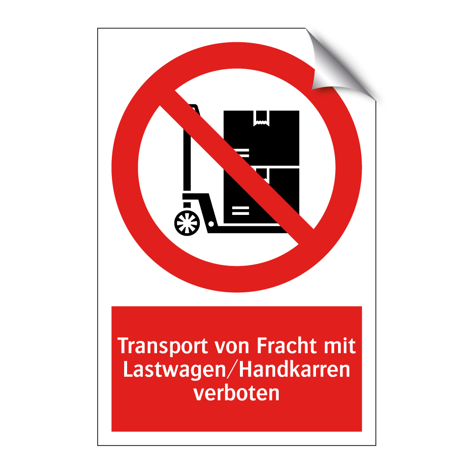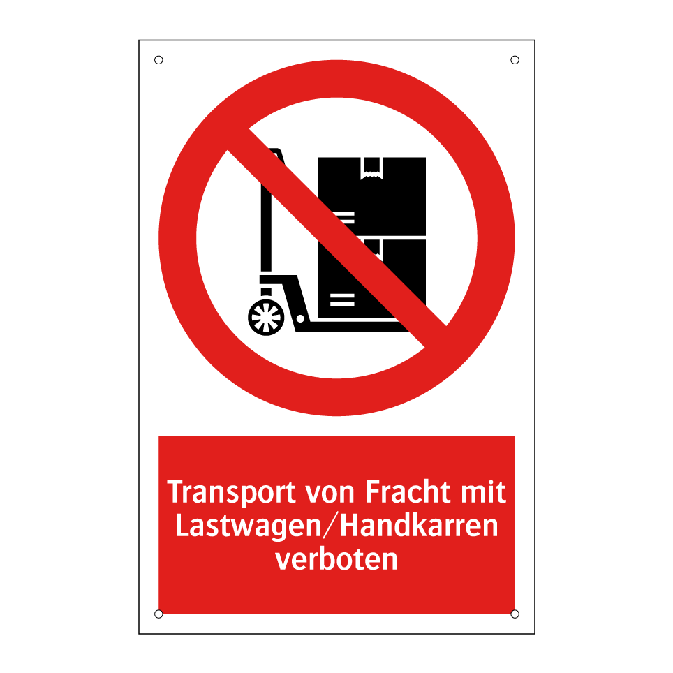 Verbotsschild mit dem Text Transport von Fracht mit Lastwagen/Handkarren verboten