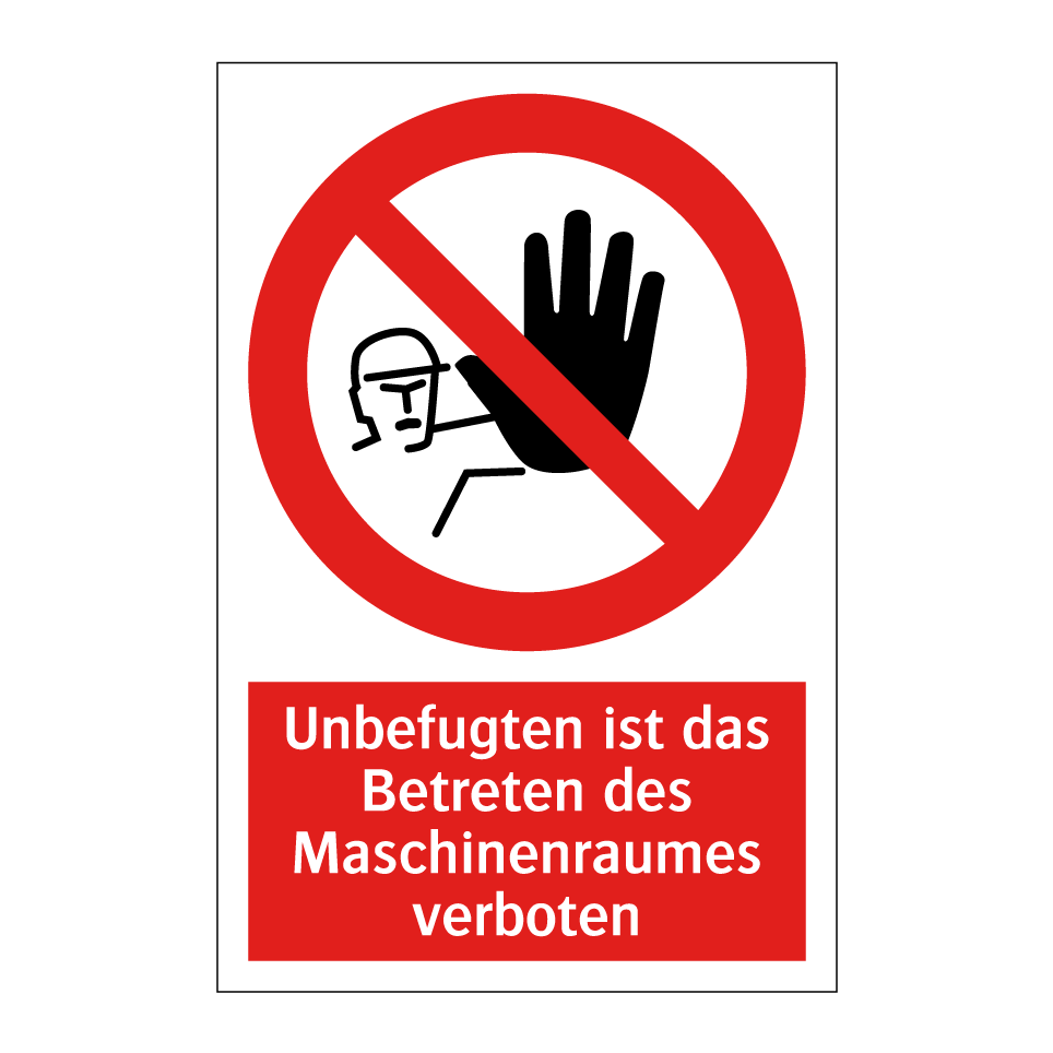 Verbotsschild mit dem Text Unbefugten ist das Betreten des Maschinenraumes verboten