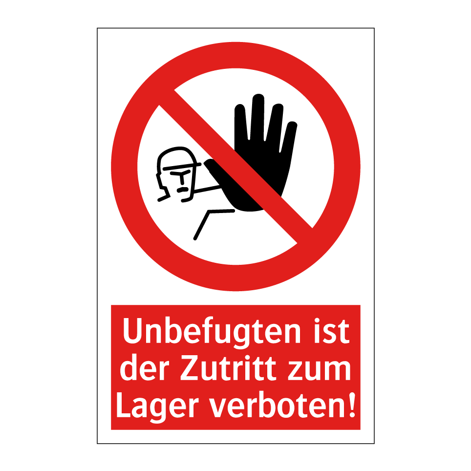 Verbotsschild mit dem Text Unbefugten ist der Zutritt zum Lager verboten!