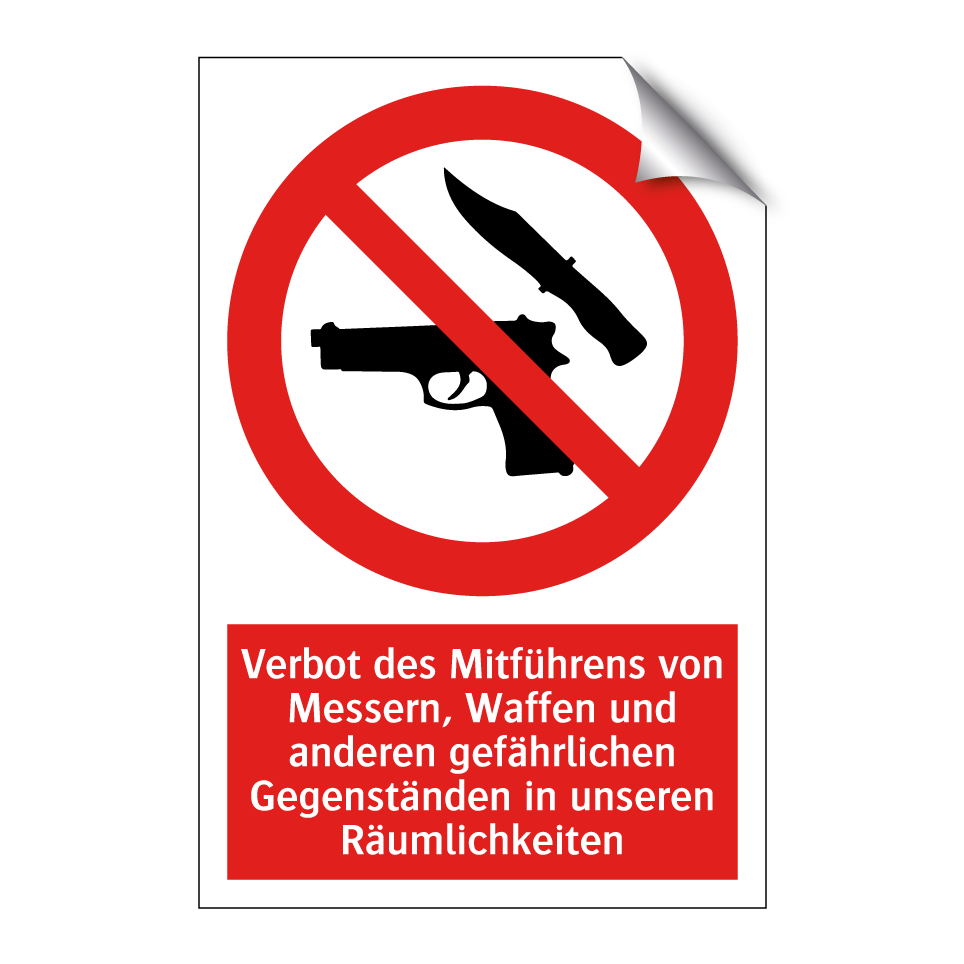 Verbotsschild mit dem Text Verbot des Mitführens von Messern, Waffen und anderen gefährlichen Gegenständen in unseren Räumlichkeiten