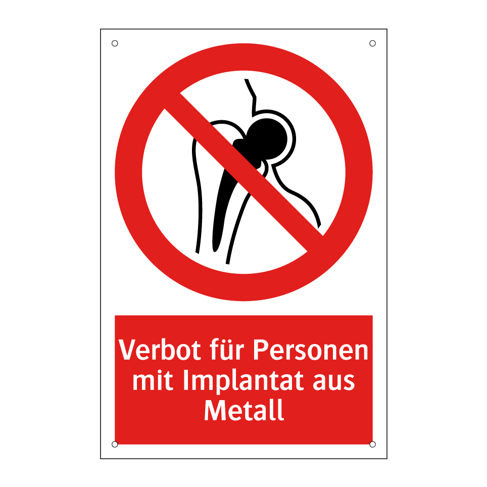 Verbotsschild mit dem Text Verbot für Personen mit Implantat aus Metall