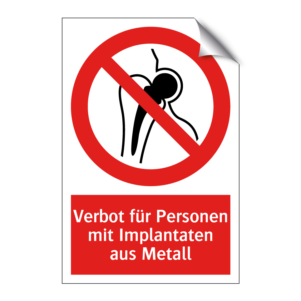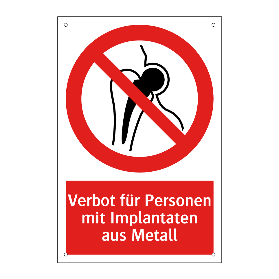 Verbotsschild mit dem Text Verbot für Personen mit Implantaten aus Metall